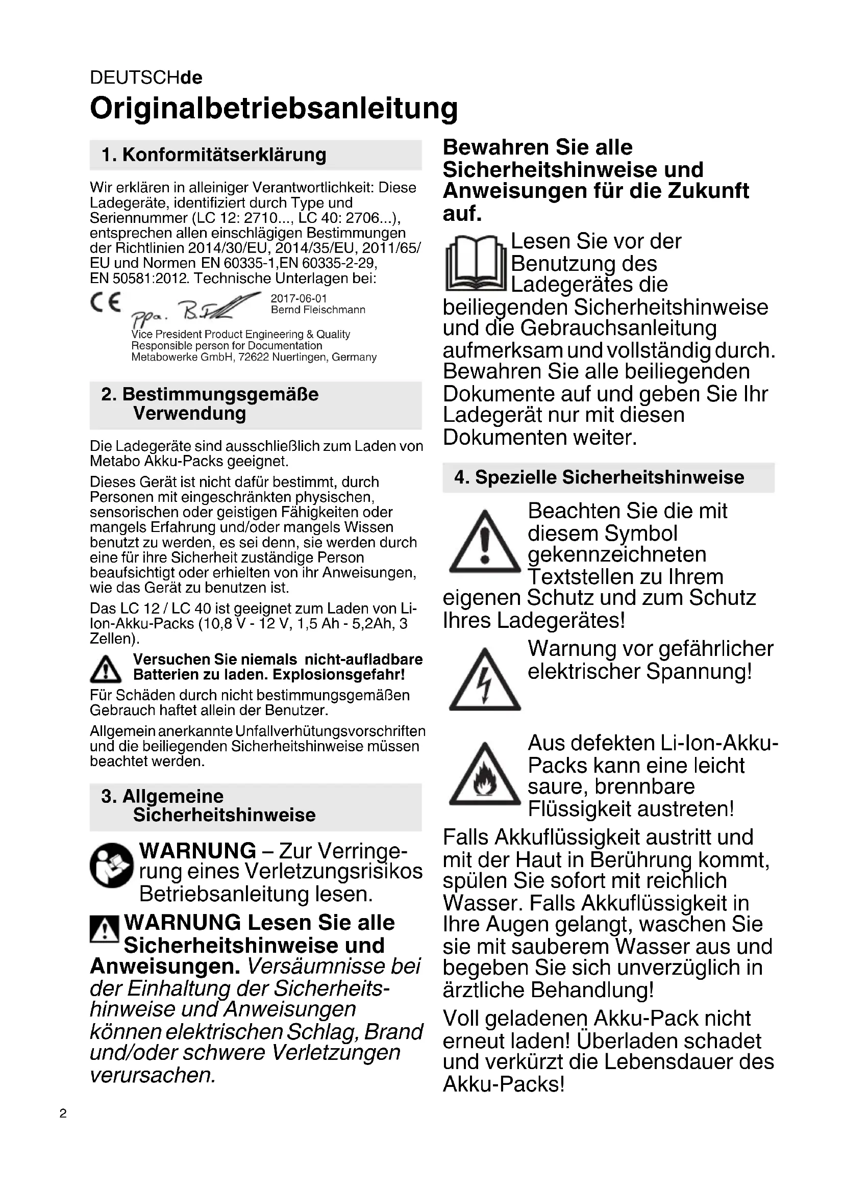 Wir erklären in alleiniger Verantwortlichkeit: Diese Ladegerate, identifiziert durch Type und Seriennummer (LC 12: 2710..., LC 40: 2706...), entsprechen allen einschlagigen Bestimmungen der Richtlinien 2014/30/EU, 2014/35/EU, 2011/65/EU und Normen EN 60335-1,EN 60335-2-29, EN 50581:2012. Technische Unterlagen bei: