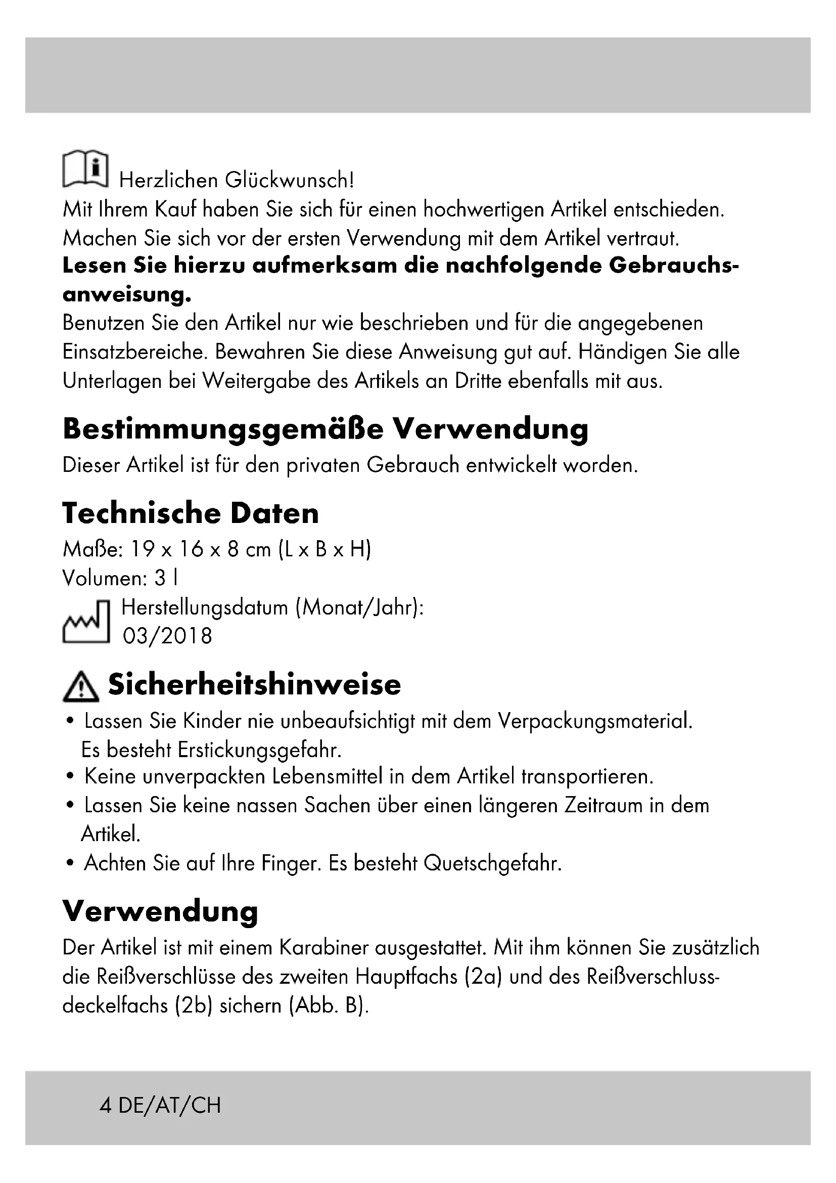 2b34 DE/AT/CH Herzlichen Glückwunsch! Mit Ihrem Kauf haben Sie sich für einen hochwertigen Artikel entschieden. Machen Sie sich vor der ersten Verwendung mit dem Artikel vertraut. Lesen Sie hierzu aufmerksam die nachfolgende Gebrauchs- anweisung. Benutzen Sie den Artikel nur wie beschrieben und für die angegebenen Einsatzbereiche. Bewahren Sie diese Anweisung gut auf. Händigen Sie alle Unterlagen bei Weitergabe des Artikels an Dritte ebenfalls mit aus. Bestimmungsgemäße Verwendung Dieser Artikel ist für den privaten Gebrauch entwickelt worden. Technische Daten Maße: 19 x 16 x 8 cm (L x B x H) Volumen: 3 l Herstellungsdatum (Monat/Jahr): 03/2018 Sicherheitshinweise