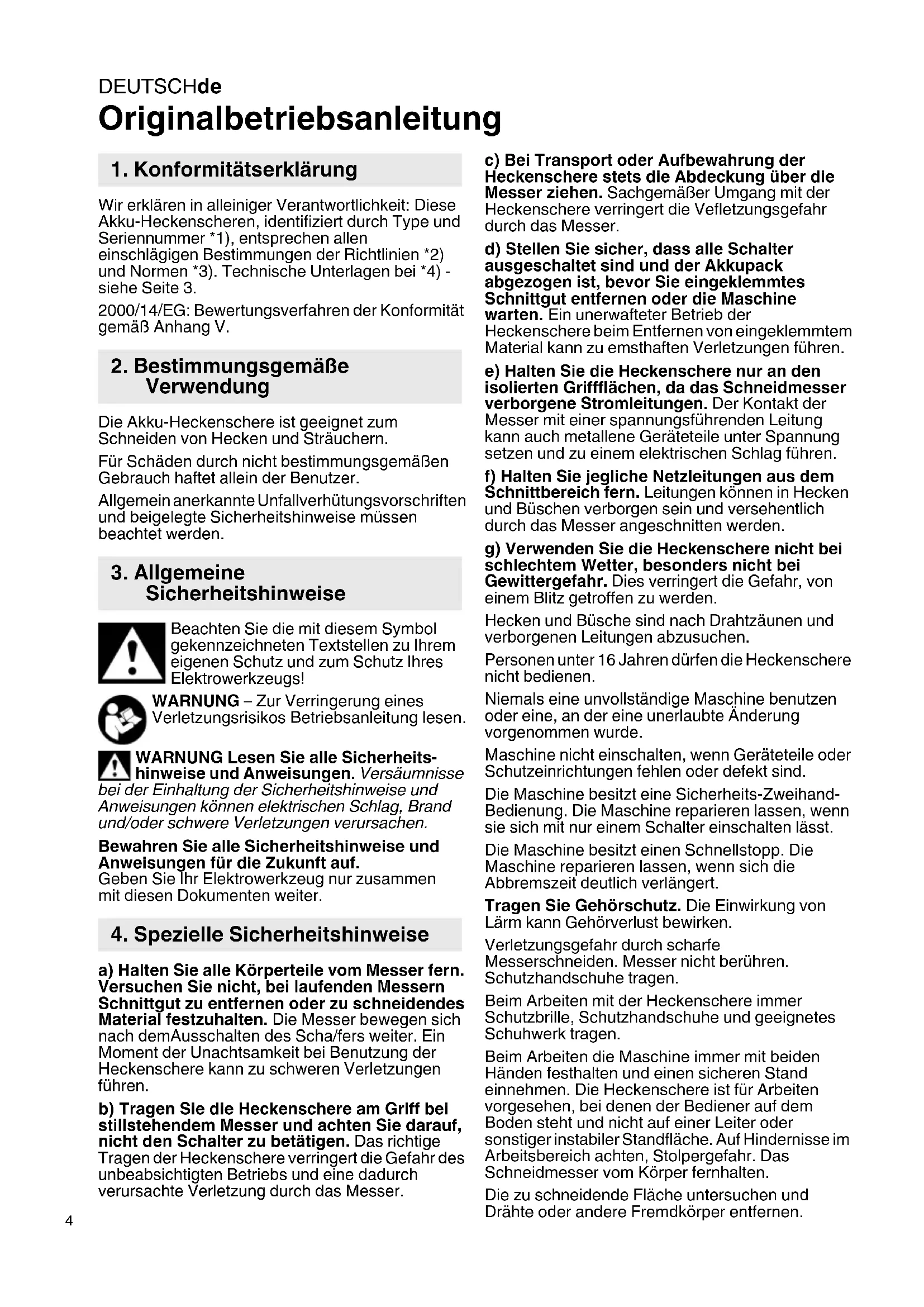 Originalbetriebsanleitung Wir erklären in alleiniger Verantwortlichkeit: Diese Akku-Heckenscheren, identifiziert durch Type und Seriennummer *1), entsprechen allen einschlägigen Bestimmungen der Richtlinien *2) und Normen *3). Technische Unterlagen bei *4) - siehe Seite 3. 2000/14/EG: Bewertungsverfahren der Konformität gemäß Anhang V. Die Akku-Heckenschere ist geeignet zum Schneiden von Hecken und Sträuchern. Für Schäden durch nicht bestimmungsgemäßen Gebrauch haftet allein der Benutzer. Allgemein anerkannte Unfallverhütungsvorschriften und beigelegte Sicherheitshinweise müssen beachtet werden. Beachten Sie die mit diesem Symbol gekennzeichneten Textstellen zu Ihrem eigenen Schutz und zum Schutz Ihres Elektrowerkzeugs! WARNUNG – Zur Verringerung eines Verletzungsrisikos Betriebsanleitung lesen. WARNUNG Lesen Sie alle Sicherheits- hinweise und Anweisungen. Versäumnisse bei der Einhaltung der Sicherheitshinweise und Anweisungen können elektrischen Schlag, Brand und/oder schwere Verletzungen verursachen. Bewahren Sie alle Sicherheitshinweise und Anweisungen für die Zukunft auf. Geben Sie Ihr Elektrowerkzeug nur zusammen mit diesen Dokumenten weiter. a) Halten Sie alle Körperteile vom Messer fern. Versuchen Sie nicht, bei laufenden Messern Schnittgut zu entfernen oder zu schneidendes Material festzuhalten. Die Messer bewegen sich nach demAusschalten des Scha/fers weiter. Ein Moment der Unachtsamkeit bei Benutzung der Heckenschere kann zu schweren Verletzungen führen. b) Tragen Sie die Heckenschere am Griff bei stillstehendem Messer und achten Sie darauf, nicht den Schalter zu betätigen. Das richtige Tragen der Heckenschere verringert die Gefahr des unbeabsichtigten Betriebs und eine dadurch verursachte Verletzung durch das Messer. c) Bei Transport oder Aufbewahrung der Heckenschere stets die Abdeckung über die Messer ziehen. Sachgemäßer Umgang mit der Heckenschere verringert die Vefletzungsgefahr durch das Messer. d) Stellen Sie sicher, dass alle Schalter ausgeschaltet sind und der Akkupack abgezogen ist, bevor Sie eingeklemmtes Schnittgut entfernen oder die Maschine warten. Ein unerwafteter Betrieb der Heckenschere beim Entfernen von eingeklemmtem Material kann zu emsthaften Verletzungen führen. e) Halten Sie die Heckenschere nur an den isolierten Griffflächen, da das Schneidmesser verborgene Stromleitungen. Der Kontakt der Messer mit einer spannungsführenden Leitung kann auch metallene Geräteteile unter Spannung setzen und zu einem elektrischen Schlag führen. f) Halten Sie jegliche Netzleitungen aus dem Schnittbereich fern. Leitungen können in Hecken und Büschen verborgen sein und versehentlich durch das Messer angeschnitten werden. g) Verwenden Sie die Heckenschere nicht bei schlechtem Wetter, besonders nicht bei Gewittergefahr. Dies verringert die Gefahr, von einem Blitz getroffen zu werden. Hecken und Büsche sind nach Drahtzäunen und verborgenen Leitungen abzusuchen. Personen unter 16 Jahren dürfen die Heckenschere nicht bedienen. Niemals eine unvollständige Maschine benutzen oder eine, an der eine unerlaubte Änderung vorgenommen wurde. Maschine nicht einschalten, wenn Geräteteile oder Schutzeinrichtungen fehlen oder defekt sind. Die Maschine besitzt eine Sicherheits-Zweihand- Bedienung. Die Maschine reparieren lassen, wenn sie sich mit nur einem Schalter einschalten lässt. Die Maschine besitzt einen Schnellstopp. Die Maschine reparieren lassen, wenn sich die Abbremszeit deutlich verlängert. Tragen Sie Gehörschutz. Die Einwirkung von Lärm kann Gehörverlust bewirken. Verletzungsgefahr durch scharfe Messerschneiden. Messer nicht berühren. Schutzhandschuhe tragen. Beim Arbeiten mit der Heckenschere immer Schutzbrille, Schutzhandschuhe und geeignetes Schuhwerk tragen. Beim Arbeiten die Maschine immer mit beiden Händen festhalten und einen sicheren Stand einnehmen. Die Heckenschere ist für Arbeiten vorgesehen, bei denen der Bediener auf dem Boden steht und nicht auf einer Leiter oder sonstiger instabiler Standfläche. Auf Hindernisse im Arbeitsbereich achten, Stolpergefahr. Das Schneidmesser vom Körper fernhalten. Die zu schneidende Fläche untersuchen und Drähte oder andere Fremdkörper entfernen.