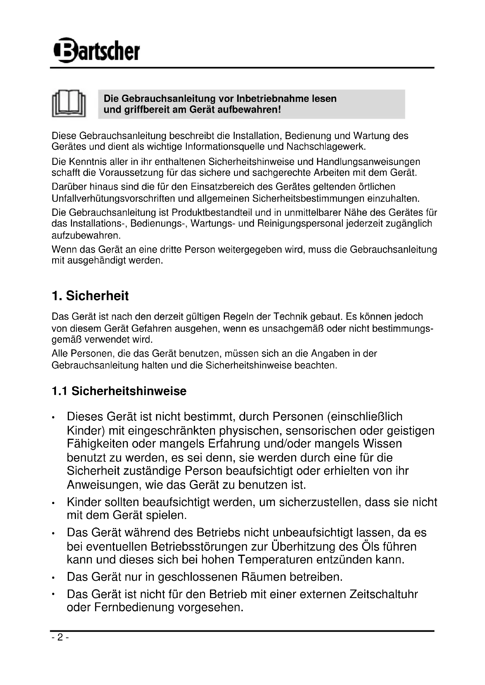 Bartscher GmbH Franz-Kleine-Str. 28 D-33154 Salzkotten Tel.: +49 (0) 5258 971-0 Service-Hotline: 0180 5 971 197 Germany Fax: +49 (0) 5258 971- 120 (14ct/Min. aus dem deutschen Festnetz) D/A/CH- 2 -