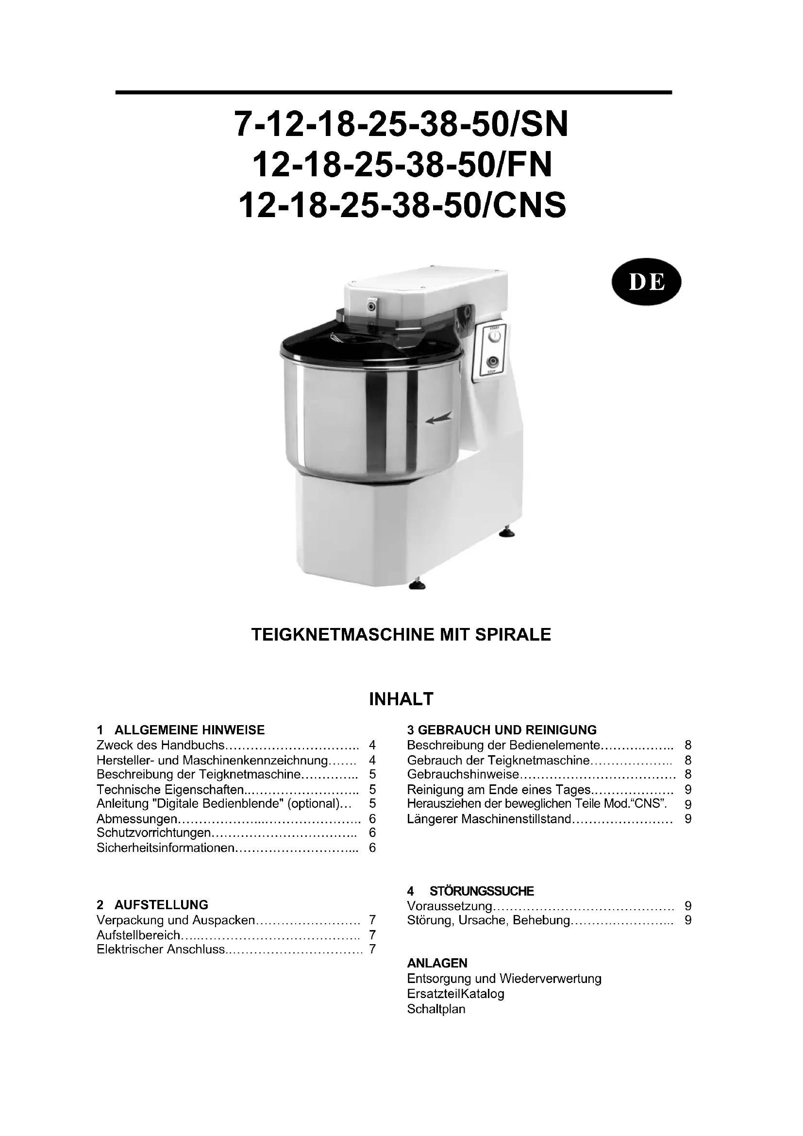 - Nach Beendigung eines Bearbeitungvorgangs Schüssel und Spirale mit heißem Wasser und Reinigungsmitteln säubern. • Die Deckelinenseite mit einem feuchten Schwamm reinigen. Gebrauchshinweise Etwa 2 Kg. Mehl pro Liter Wasser ist die Faustregel; man sollte jedoch von Fall zu Fall und je nach Teig- und Mehltyp entscheiden. Es wird empfohlen, immer erst Wasser in die Schüssel zu geben. Teigkapazität: Mod.7/SN: 2,5 Liter Wasser und 2 Kg. Mehl in die Schüssel geben. Nach 1-2 Minuten Bearbeitung weitere 2,5 Kg. Mehl hinzufügen. Mod.12/SN-12/CNS-12/FN: 4 Liter Wasser und 4 Kg. Mehl in die Schüssel geben. Nach 1-2 Minuten Bearbeitung weitere 4 Kg. Mehl hinzufügen. Mod.18/SN-18/CNS-18/FN: 6 Liter Wasser und 6 Kg. Mehl in die Schüssel geben. Nach 1-2 Minuten Bearbeitung weitere 6 Kg. Mehl hinzufügen. Mod.25/SN-25/CNS-25/FN: 8 Liter Wasser und 8 Kg. Mehl in die Schüssel geben. Nach 1-2 Minuten Bearbeitung weitere 9 Kg. Mehl hinzufügen. Mod.38/SN-38/CNS-38/FN: 13 Liter Wasser und 12 Kg. Mehl in die Schüssel geben. Nach 1-2 Minuten Bearbeitung weitere 13 Kg. Mehl hinzufügen. Mod.50/SN-50/CNS-50/FN: 17 Liter Wasser und 16 Kg. Mehl in die Schüssel geben. Nach 1-2 Minuten Bearbeitung weitere 17 Kg. Mehl hinzufügen 8GEBRAUCH UND REINIGUNG