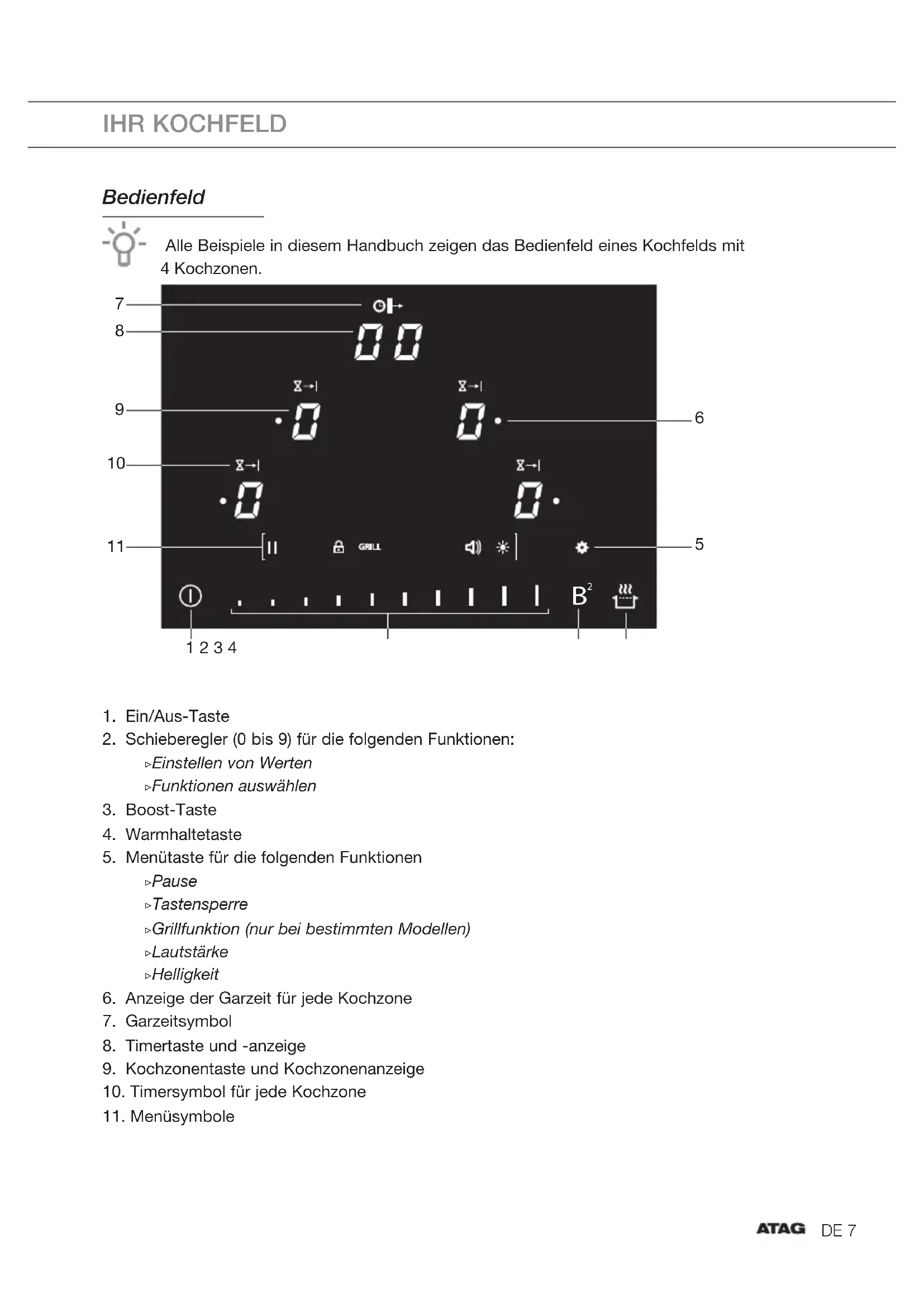 IHR KOCHFELDDE 7 IHR KOCHFELD Bedienfeld Alle Beispiele in diesem Handbuch zeigen das Bedienfeld eines Kochfelds mit 4Kochzonen.