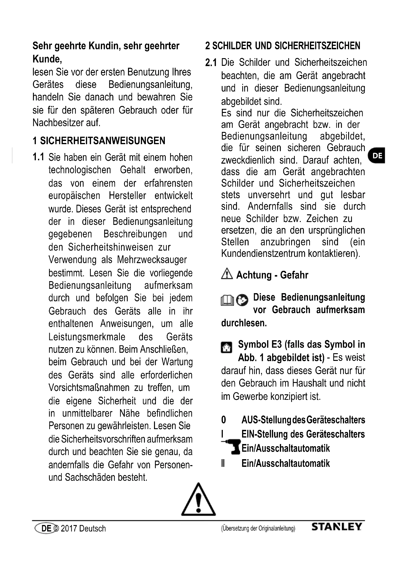 Die Schilder und Sicherheitszeichen beachten, die am Gerät angebracht und in dieser Bedienungsanleitung abgebildet sind. Es sind nur die Sicherheitszeichen am Gerät angebracht bzw. in der Bedienungsanleitung abgebildet, die für seinen sicheren Gebrauch zweckdienlich sind. Darauf achten, dass die am Gerät angebrachten Schilder und Sicherheitszeichen stets unversehrt und gut lesbar sind. Andernfalls sind sie durch neue Schilder bzw. Zeichen zu ersetzen, die an den ursprünglichen Stellen anzubringen sind (ein Kundendienstzentrum kontaktieren). Achtung - Gefahr Diese Bedienungsanleitung vor Gebrauch aufmerksam durchlesen. Symbol E3 (falls das Symbol in Abb. 1 abgebildet ist) - Es weist darauf hin, dass dieses Gerät nur für den Gebrauch im Haushalt und nicht im Gewerbe konzipiert ist.