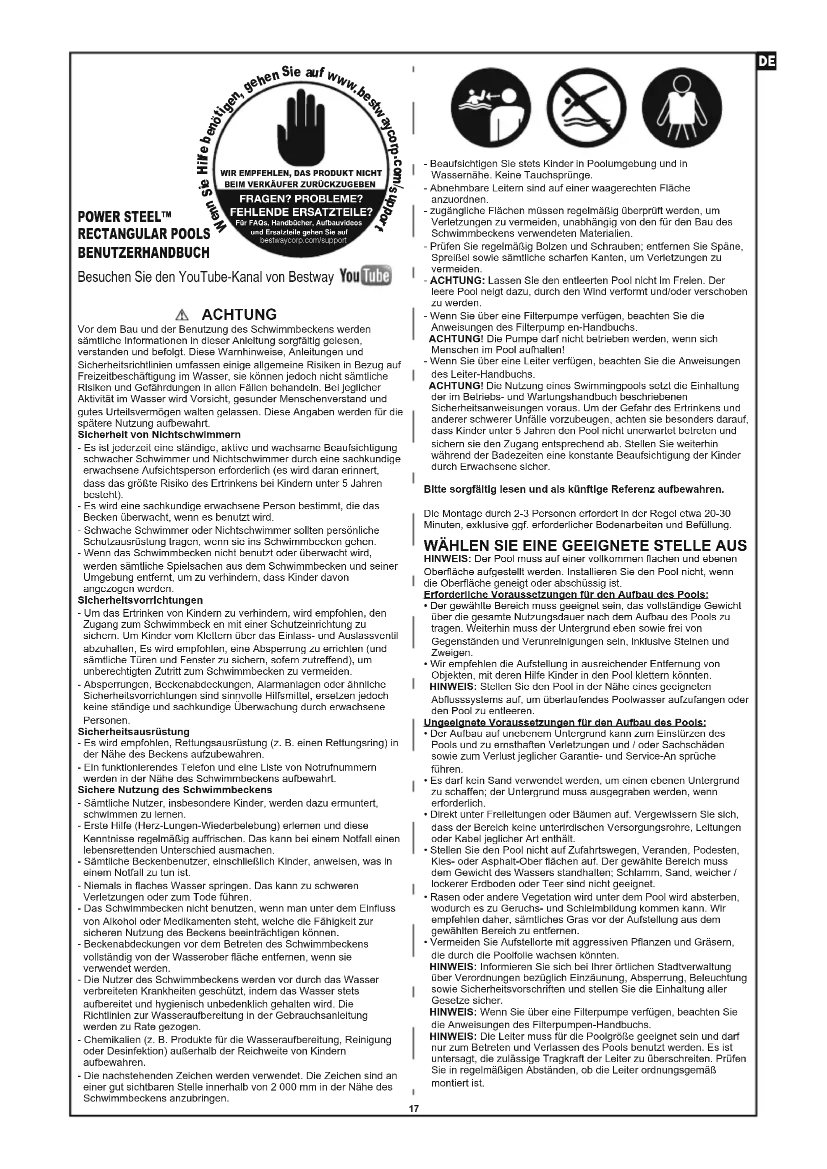 6. Recomendamos encarecidamente desmontar la piscina fuera de temporada (los meses de invierno). Guárdelo en un lugar seco fuera del alcance de los niños.17 ACHTUNG Vor dem Bau und der Benutzung des Schwimmbeckens werden sämtliche Informationen in dieser Anleitung sorgfältig gelesen, verstanden und befolgt. Diese Warnhinweise, Anleitungen und Sicherheitsrichtlinien umfassen einige allgemeine Risiken in Bezug auf Freizeitbeschäftigung im Wasser, sie können jedoch nicht sämtliche Risiken und Gefährdungen in allen Fällen behandeln. Bei jeglicher Aktivität im Wasser wird Vorsicht, gesunder Menschenverstand und gutes Urteilsvermögen walten gelassen. Diese Angaben werden für die spätere Nutzung aufbewahrt.Sicherheit von Nichtschwimmern- Es ist jederzeit eine ständige, aktive und wachsame Beaufsichtigung schwacher Schwimmer und Nichtschwimmer durch eine sachkundige erwachsene Aufsichtsperson erforderlich (es wird daran erinnert, dass das größte Risiko des Ertrinkens bei Kindern unter 5 Jahren besteht).- Es wird eine sachkundige erwachsene Person bestimmt, die das Becken überwacht, wenn es benutzt wird.- Schwache Schwimmer oder Nichtschwimmer sollten persönliche Schutzausrüstung tragen, wenn sie ins Schwimmbecken gehen.- Wenn das Schwimmbecken nicht benutzt oder überwacht wird, werden sämtliche Spielsachen aus dem Schwimmbecken und seiner Umgebung entfernt, um zu verhindern, dass Kinder davon angezogen werden.Sicherheitsvorrichtungen- Um das Ertrinken von Kindern zu verhindern, wird empfohlen, den Zugang zum Schwimmbeck en mit einer Schutzeinrichtung zu sichern. Um Kinder vom Klettern über das Einlass- und Auslassventil abzuhalten, Es wird empfohlen, eine Absperrung zu errichten (und sämtliche Türen und Fenster zu sichern, sofern zutreffend), um unberechtigten Zutritt zum Schwimmbecken zu vermeiden.- Absperrungen, Beckenabdeckungen, Alarmanlagen oder ähnliche Sicherheitsvorrichtungen sind sinnvolle Hilfsmittel, ersetzen jedoch keine ständige und sachkundige Überwachung durch erwachsene Personen.Sicherheitsausrüstung- Es wird empfohlen, Rettungsausrüstung (z. B. einen Rettungsring) in der Nähe des Beckens aufzubewahren.- Ein funktionierendes Telefon und eine Liste von Notrufnummern werden in der Nähe des Schwimmbeckens aufbewahrt.Sichere Nutzung des Schwimmbeckens- Sämtliche Nutzer, insbesondere Kinder, werden dazu ermuntert, schwimmen zu lernen.- Erste Hilfe (Herz-Lungen-Wiederbelebung) erlernen und diese Kenntnisse regelmäßig auffrischen. Das kann bei einem Notfall einen lebensrettenden Unterschied ausmachen.- Sämtliche Beckenbenutzer, einschließlich Kinder, anweisen, was in einem Notfall zu tun ist.- Niemals in flaches Wasser springen. Das kann zu schweren Verletzungen oder zum Tode führen.- Das Schwimmbecken nicht benutzen, wenn man unter dem Einfluss von Alkohol oder Medikamenten steht, welche die Fähigkeit zur sicheren Nutzung des Beckens beeinträchtigen können.- Beckenabdeckungen vor dem Betreten des Schwimmbeckens vollständig von der Wasserober fläche entfernen, wenn sie verwendet werden.- Die Nutzer des Schwimmbeckens werden vor durch das Wasser verbreiteten Krankheiten geschützt, indem das Wasser stets aufbereitet und hygienisch unbedenklich gehalten wird. Die Richtlinien zur Wasseraufbereitung in der Gebrauchsanleitung werden zu Rate gezogen.- Chemikalien (z. B. Produkte für die Wasseraufbereitung, Reinigung oder Desinfektion) außerhalb der Reichweite von Kindern aufbewahren.- Die nachstehenden Zeichen werden verwendet. Die Zeichen sind an einer gut sichtbaren Stelle innerhalb von 2 000 mm in der Nähe des Schwimmbeckens anzubringen. POWER STEEL™ RECTANGULAR POOLS BENUTZERHANDBUCH - Beaufsichtigen Sie stets Kinder in Poolumgebung und in Wassernähe. Keine Tauchsprünge.- Abnehmbare Leitern sind auf einer waagerechten Fläche anzuordnen.- zugängliche Flächen müssen regelmäßig überprüft werden, um Verletzungen zu vermeiden, unabhängig von den für den Bau des Schwimmbeckens verwendeten Materialien.- Prüfen Sie regelmäßig Bolzen und Schrauben; entfernen Sie Späne, Spreißel sowie sämtliche scharfen Kanten, um Verletzungen zu vermeiden.- ACHTUNG: Lassen Sie den entleerten Pool nicht im Freien. Der leere Pool neigt dazu, durch den Wind verformt und/oder verschoben zu werden.- Wenn Sie über eine Filterpumpe verfügen, beachten Sie die Anweisungen des Filterpump en-Handbuchs. ACHTUNG! Die Pumpe darf nicht betrieben werden, wenn sich Menschen im Pool aufhalten!- Wenn Sie über eine Leiter verfügen, beachten Sie die Anweisungen des Leiter-Handbuchs. ACHTUNG! Die Nutzung eines Swimmingpools setzt die Einhaltung der im Betriebs- und Wartungshandbuch beschriebenen Sicherheitsanweisungen voraus. Um der Gefahr des Ertrinkens und anderer schwerer Unfälle vorzubeugen, achten sie besonders darauf, dass Kinder unter 5 Jahren den Pool nicht unerwartet betreten und sichern sie den Zugang entsprechend ab. Stellen Sie weiterhin während der Badezeiten eine konstante Beaufsichtigung der Kinder durch Erwachsene sicher.Bitte sorgfältig lesen und als künftige Referenz aufbewahren.Die Montage durch 2-3 Personen erfordert in der Regel etwa 20-30 Minuten, exklusive ggf. erforderlicher Bodenarbeiten und Befüllung. WÄHLEN SIE EINE GEEIGNETE STELLE AUS HINWEIS: Der Pool muss auf einer vollkommen flachen und ebenen Oberfläche aufgestellt werden. Installieren Sie den Pool nicht, wenn die Oberfläche geneigt oder abschüssig ist.Erforderliche Voraussetzungen für den Aufbau des Pools:• Der gewählte Bereich muss geeignet sein, das vollständige Gewicht über die gesamte Nutzungsdauer nach dem Aufbau des Pools zu tragen. Weiterhin muss der Untergrund eben sowie frei von Gegenständen und Verunreinigungen sein, inklusive Steinen und Zweigen.• Wir empfehlen die Aufstellung in ausreichender Entfernung von Objekten, mit deren Hilfe Kinder in den Pool klettern könnten. HINWEIS: Stellen Sie den Pool in der Nähe eines geeigneten Abflusssystems auf, um üb