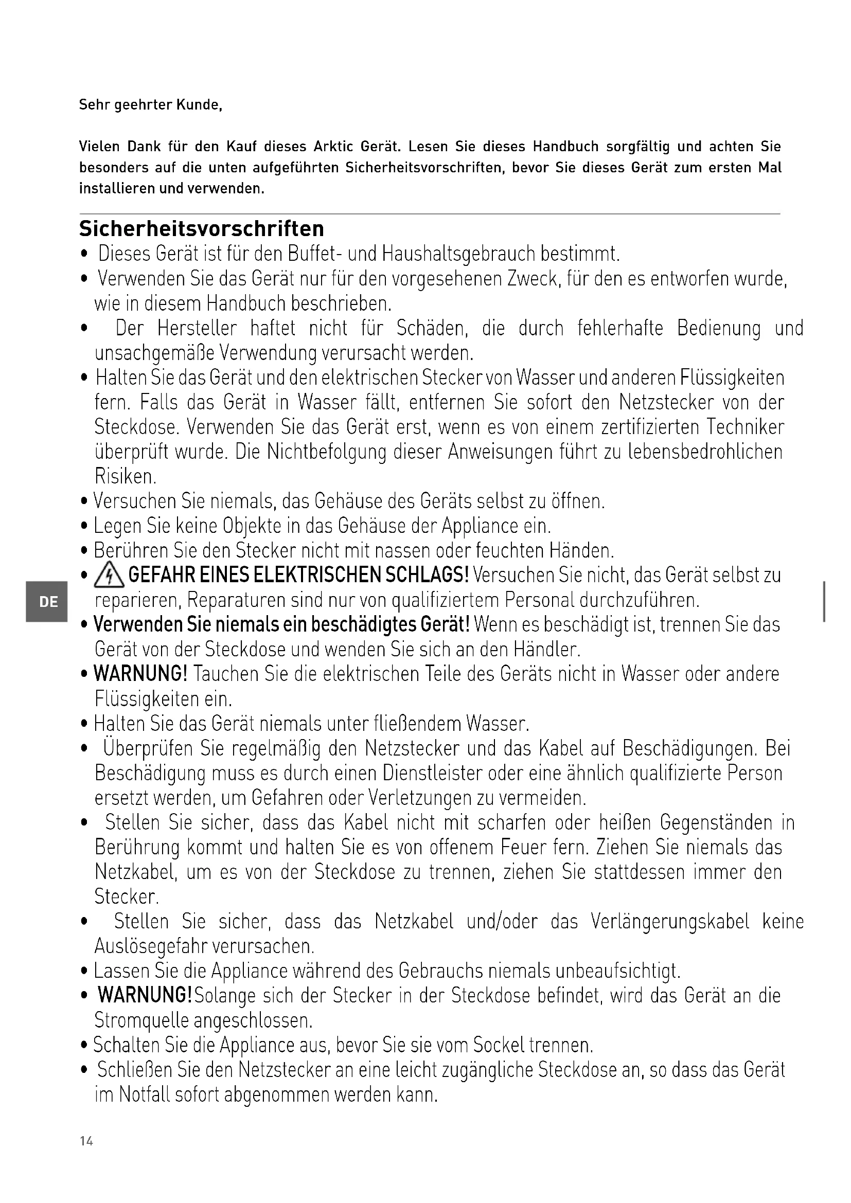 Sehr geehrter Kunde, Vielen Dank für den Kauf dieses Arktic Gerät. Lesen Sie dieses Handbuch sorgfältig und achten Sie besonders auf die unten aufgeführten Sicherheitsvorschriften, bevor Sie dieses Gerät zum ersten Mal installieren und verwenden. Sicherheitsvorschriften