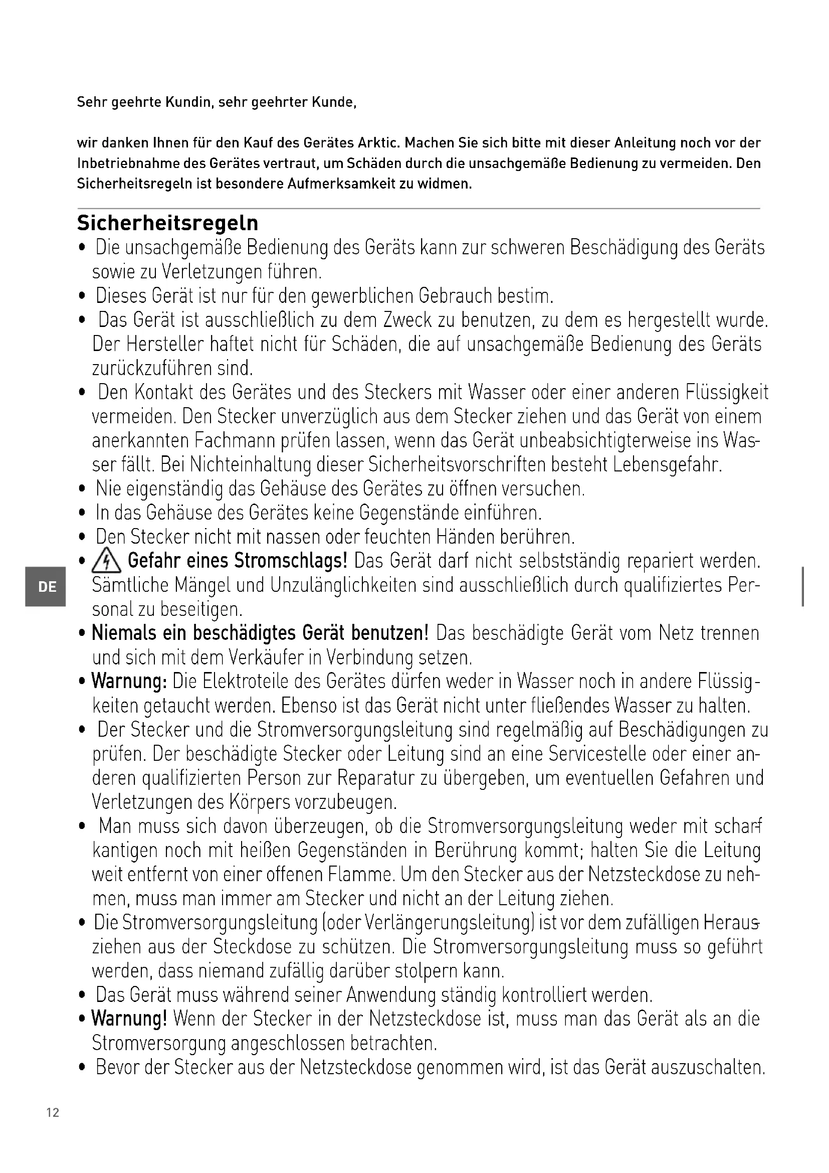 Sehr geehrte Kundin, sehr geehrter Kunde, wir danken Ihnen für den Kauf des Gerätes Arktic. Machen Sie sich bitte mit dieser Anleitung noch vor der Inbetriebnahme des Gerätes vertraut, um Schäden durch die unsachgemäße Bedienung zu vermeiden. Den Sicherheitsregeln ist besondere Aufmerksamkeit zu widmen. Sicherheitsregeln