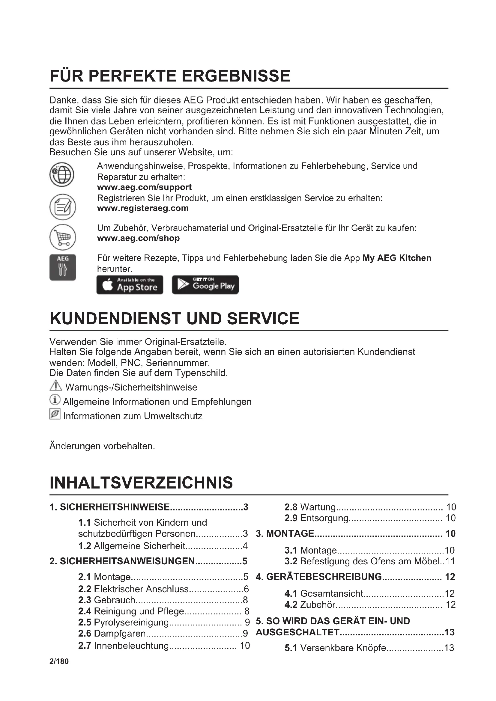 Danke, dass Sie sich für dieses AEG Produkt entschieden haben. Wir haben es geschaffen, damit Sie viele Jahre von seiner ausgezeichneten Leistung und den innovativen Technologien, die Ihnen das Leben erleichtern, profitieren können. Es ist mit Funktionen ausgestattet, die in gewöhnlichen Geräten nicht vorhanden sind. Bitte nehmen Sie sich ein paar Minuten Zeit, um das Beste aus ihm herauszuholen. Besuchen Sie uns auf unserer Website, um: Anwendungshinweise, Prospekte, Informationen zu Fehlerbehebung, Service und Reparatur zu erhalten: www.aeg.com/support Registrieren Sie Ihr Produkt, um einen erstklassigen Service zu erhalten: www.registeraeg.com Um Zubehör, Verbrauchsmaterial und Original-Ersatzteile für Ihr Gerät zu kaufen: www.aeg.com/shop Für weitere Rezepte, Tipps und Fehlerbehebung laden Sie die App My AEG Kitchen herunter.