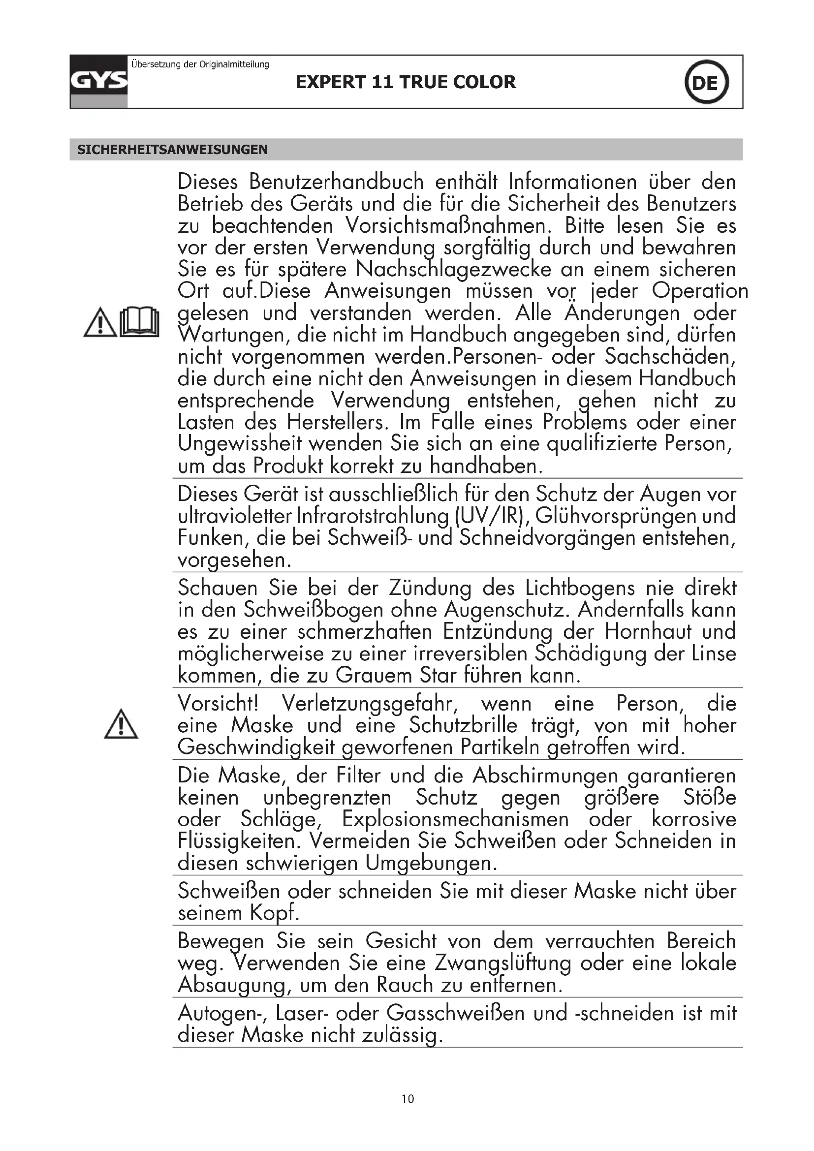 Übersetzung der Originalmitteilung SICHERHEITSANWEISUNGEN Dieses Benutzerhandbuch enthält Informationen über den Betrieb des Geräts und die für die Sicherheit des Benutzers zu beachtenden Vorsichtsmaßnahmen. Bitte lesen Sie es vor der ersten Verwendung sorgfältig durch und bewahren Sie es für spätere Nachschlagezwecke an einem sicheren Ort auf.Diese Anweisungen müssen vor jeder Operation gelesen und verstanden werden. Alle Änderungen oder Wartungen, die nicht im Handbuch angegeben sind, dürfen nicht vorgenommen werden.Personen- oder Sachschäden, die durch eine nicht den Anweisungen in diesem Handbuch entsprechende Verwendung entstehen, gehen nicht zu Lasten des Herstellers. Im Falle eines Problems oder einer Ungewissheit wenden Sie sich an eine qualizierte Person, um das Produkt korrekt zu handhaben. Dieses Gerät ist ausschließlich für den Schutz der Augen vor ultravioletter Infrarotstrahlung (UV/IR), Glühvorsprüngen und Funken, die bei Schweiß- und Schneidvorgängen entstehen, vorgesehen. Schauen Sie bei der Zündung des Lichtbogens nie direkt in den Schweißbogen ohne Augenschutz. Andernfalls kann es zu einer schmerzhaften Entzündung der Hornhaut und möglicherweise zu einer irreversiblen Schädigung der Linse kommen, die zu Grauem Star führen kann. Vorsicht! Verletzungsgefahr, wenn eine Person, die eine Maske und eine Schutzbrille trägt, von mit hoher Geschwindigkeit geworfenen Partikeln getroffen wird. Die Maske, der Filter und die Abschirmungen garantieren keinen unbegrenzten Schutz gegen größere Stöße oder Schläge, Explosionsmechanismen oder korrosive Flüssigkeiten. Vermeiden Sie Schweißen oder Schneiden in diesen schwierigen Umgebungen. Schweißen oder schneiden Sie mit dieser Maske nicht über seinem Kopf. Bewegen Sie sein Gesicht von dem verrauchten Bereich weg. Verwenden Sie eine Zwangslüftung oder eine lokale Absaugung, um den Rauch zu entfernen. Autogen-, Laser- oder Gasschweißen und -schneiden ist mit dieser Maske nicht zulässig.11
