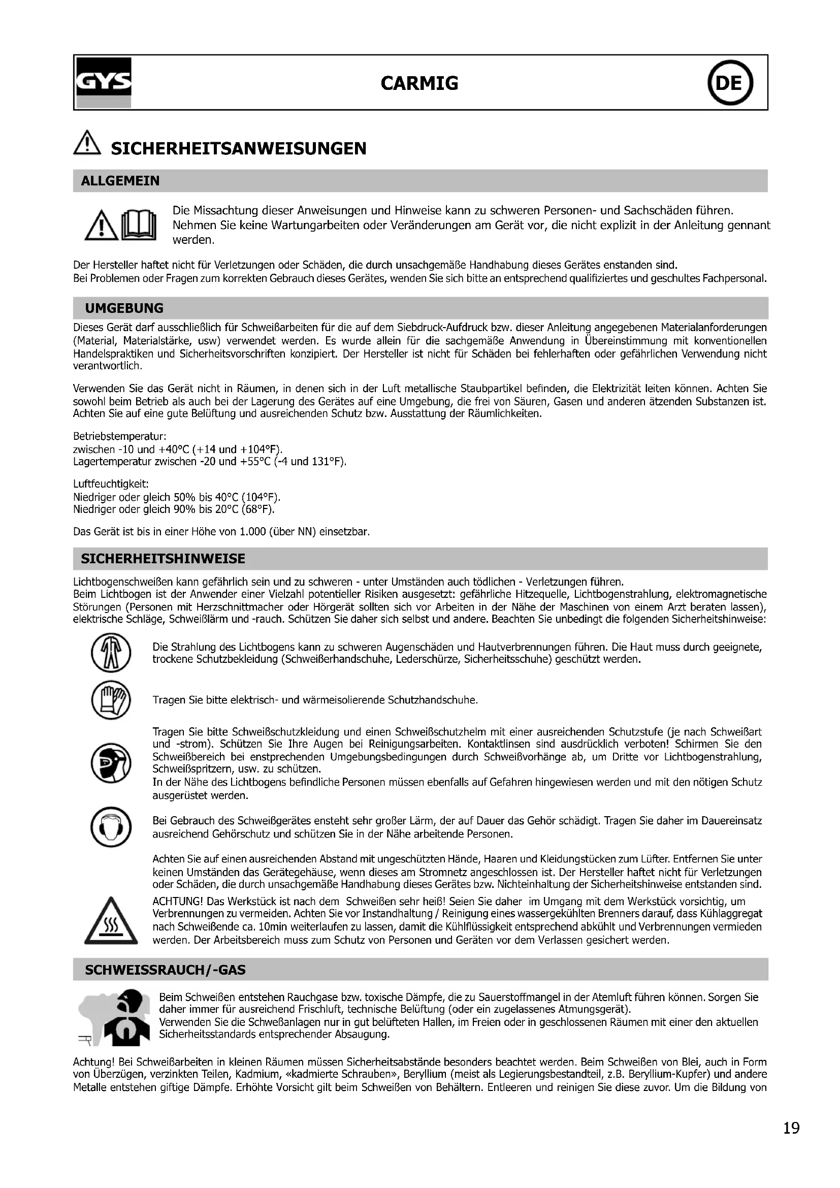 SICHERHEITSANWEISUNGEN ALLGEMEIN Die Missachtung dieser Anweisungen und Hinweise kann zu schweren Personen- und Sachschäden führen. Nehmen Sie keine Wartungarbeiten oder Veränderungen am Gerät vor, die nicht explizit in der Anleitung gennant werden. Der Hersteller haftet nicht für Verletzungen oder Schäden, die durch unsachgemäße Handhabung dieses Gerätes enstanden sind. Bei Problemen oder Fragen zum korrekten Gebrauch dieses Gerätes, wenden Sie sich bitte an entsprechend qualiziertes und geschultes Fachpersonal. UMGEBUNG Dieses Gerät darf ausschließlich für Schweißarbeiten für die auf dem Siebdruck-Aufdruck bzw. dieser Anleitung angegebenen Materialanforderungen (Material, Materialstärke, usw) verwendet werden. Es wurde allein für die sachgemäße Anwendung in Übereinstimmung mit konventionellen Handelspraktiken und Sicherheitsvorschriften konzipiert. Der Hersteller ist nicht für Schäden bei fehlerhaften oder gefährlichen Verwendung nicht verantwortlich. Verwenden Sie das Gerät nicht in Räumen, in denen sich in der Luft metallische Staubpartikel benden, die Elektrizität leiten können. Achten Sie sowohl beim Betrieb als auch bei der Lagerung des Gerätes auf eine Umgebung, die frei von Säuren, Gasen und anderen ätzenden Substanzen ist. Achten Sie auf eine gute Belüftung und ausreichenden Schutz bzw. Ausstattung der Räumlichkeiten.Betriebstemperatur:zwischen -10 und +40°C (+14 und +104°F).Lagertemperatur zwischen -20 und +55°C (-4 und 131°F).Luftfeuchtigkeit:Niedriger oder gleich 50% bis 40°C (104°F).Niedriger oder gleich 90% bis 20°C (68°F).Das Gerät ist bis in einer Höhe von 1.000 (über NN) einsetzbar. SICHERHEITSHINWEISE Lichtbogenschweißen kann gefährlich sein und zu schweren - unter Umständen auch tödlichen - Verletzungen führen. Beim Lichtbogen ist der Anwender einer Vielzahl potentieller Risiken ausgesetzt: gefährliche Hitzequelle, Lichtbogenstrahlung, elektromagnetische Störungen (Personen mit Herzschnittmacher oder Hörgerät sollten sich vor Arbeiten in der Nähe der Maschinen von einem Arzt beraten lassen), elektrische Schläge, Schweißlärm und -rauch. Schützen Sie daher sich selbst und andere. Beachten Sie unbedingt die folgenden Sicherheitshinweise: Die Strahlung des Lichtbogens kann zu schweren Augenschäden und Hautverbrennungen führen. Die Haut muss durch geeignete, trockene Schutzbekleidung (Schweißerhandschuhe, Lederschürze, Sicherheitsschuhe) geschützt werden.Tragen Sie bitte elektrisch- und wärmeisolierende Schutzhandschuhe. Tragen Sie bitte Schweißschutzkleidung und einen Schweißschutzhelm mit einer ausreichenden Schutzstufe (je nach Schweißart und -strom). Schützen Sie Ihre Augen bei Reinigungsarbeiten. Kontaktlinsen sind ausdrücklich verboten! Schirmen Sie den Schweißbereich bei enstprechenden Umgebungsbedingungen durch Schweißvorhänge ab, um Dritte vor Lichtbogenstrahlung, Schweißspritzern, usw. zu schützen. In der Nähe des Lichtbogens bendliche Personen müssen ebenfalls auf Gefahren hingewiesen werden und mit den nötigen Schutz ausgerüstet werden. Bei Gebrauch des Schweißgerätes ensteht sehr großer Lärm, der auf Dauer das Gehör schädigt. Tragen Sie daher im Dauereinsatz ausreichend Gehörschutz und schützen Sie in der Nähe arbeitende Personen. Achten Sie auf einen ausreichenden Abstand mit ungeschützten Hände, Haaren und Kleidungstücken zum Lüfter. Entfernen Sie unter keinen Umständen das Gerätegehäuse, wenn dieses am Stromnetz angeschlossen ist. Der Hersteller haftet nicht für Verletzungen oder Schäden, die durch unsachgemäße Handhabung dieses Gerätes bzw. Nichteinhaltung der Sicherheitshinweise entstanden sind. ACHTUNG! Das Werkstück ist nach dem Schweißen sehr heiß! Seien Sie daher im Umgang mit dem Werkstück vorsichtig, um Verbrennungen zu vermeiden. Achten Sie vor Instandhaltung / Reinigung eines wassergekühlten Brenners darauf, dass Kühlaggregat nach Schweißende ca. 10min weiterlaufen zu lassen, damit die Kühlüssigkeit entsprechend abkühlt und Verbrennungen vermieden werden. Der Arbeitsbereich muss zum Schutz von Personen und Geräten vor dem Verlassen gesichert werden. SCHWEISSRAUCH/-GAS Beim Schweißen entstehen Rauchgase bzw. toxische Dämpfe, die zu Sauerstomangel in der Atemluft führen können. Sorgen Sie daher immer für ausreichend Frischluft, technische Belüftung (oder ein zugelassenes Atmungsgerät). Verwenden Sie die Schweßanlagen nur in gut belüfteten Hallen, im Freien oder in geschlossenen Räumen mit einer den aktuellen Sicherheitsstandards entsprechender Absaugung. Achtung! Bei Schweißarbeiten in kleinen Räumen müssen Sicherheitsabstände besonders beachtet werden. Beim Schweißen von Blei, auch in Form von Überzügen, verzinkten Teilen, Kadmium, «kadmierte Schrauben», Beryllium (meist als Legierungsbestandteil, z.B. Beryllium-Kupfer) und andere Metalle entstehen giftige Dämpfe. Erhöhte Vorsicht gilt beim Schweißen von Behältern. Entleeren und reinigen Sie diese zuvor. Um die Bildung von20 CARMIG