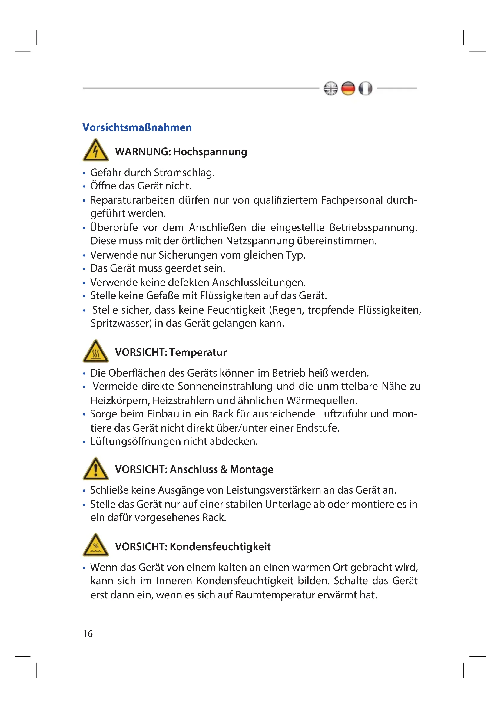 - Sorge beim Einbau in ein Rack für ausreichende Luftzufuhr und mon- tiere das Gerät nicht direkt über/unter einer Endstufe.