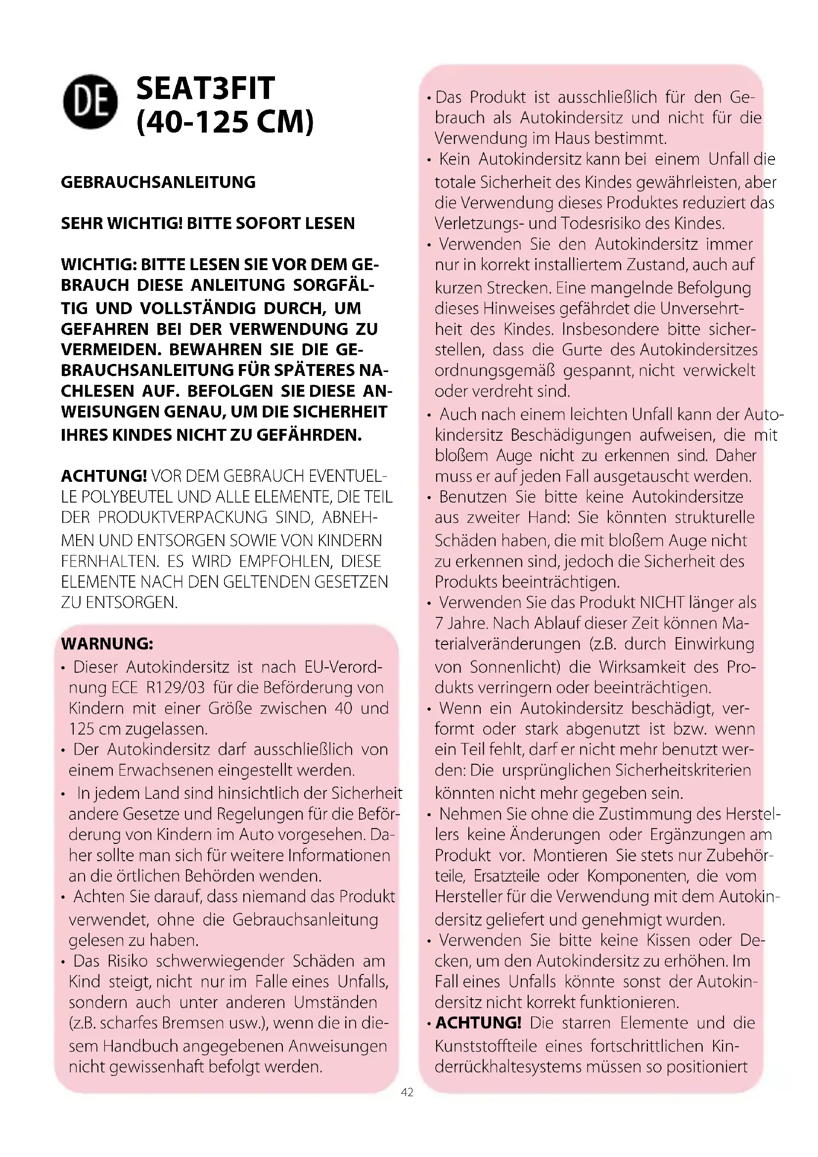 Ist die für den Autokindersitz vorgesehene Gebrauchsgrenze erreicht, entsorgen Sie ihn. Aus Umweltschutzgründen müssen die ver- schiedenen Einzelteile des Autokindersitzes getrennt und die Entsorgungsbestimmungen Ihres Landes befolgt werden. GARANTIE Die Garantie gilt bei allen Konformitätsfehlern, die trotz normaler Gebrauchsbedingungen (gemäß den Vorgaben der Gebrauchsanlei- tung) auftreten. Die Garantie ist verwirkt bei unsachgemäßem Gebrauch, Abnutzung oder bei persönlichen Unglücksfällen. Für die Lauf- zeit der Garantie auf Konformitätsmängel wird auf die besonderen Bestimmungen der natio- nalen Gesetzesvorschriften verwiesen, die im Land des Kaufs gelten, soweit vorgesehen.51 SEAT3FIT (40-125 CM)