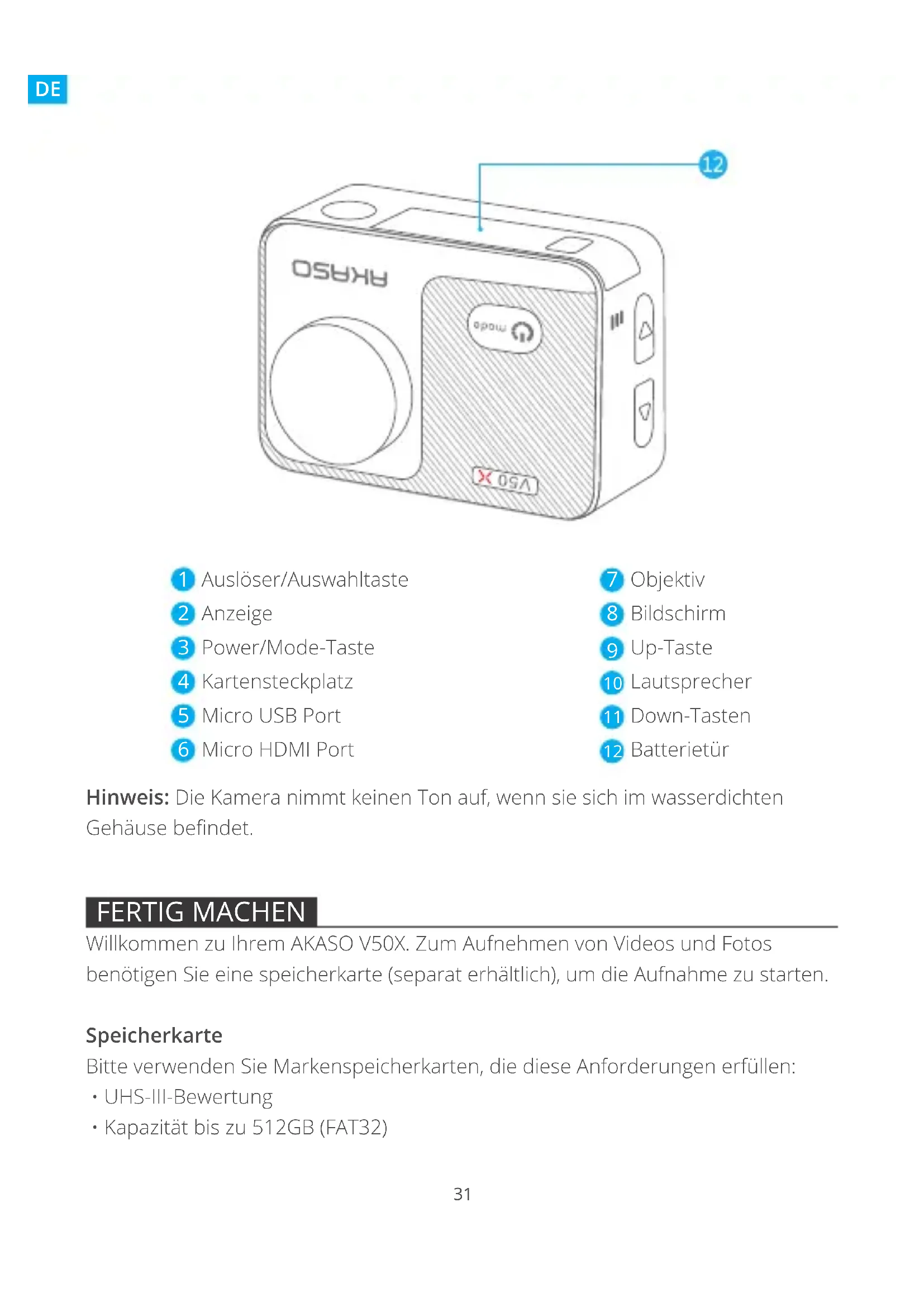 BEDIENUNGSANLEITUNG V50 X Akaso