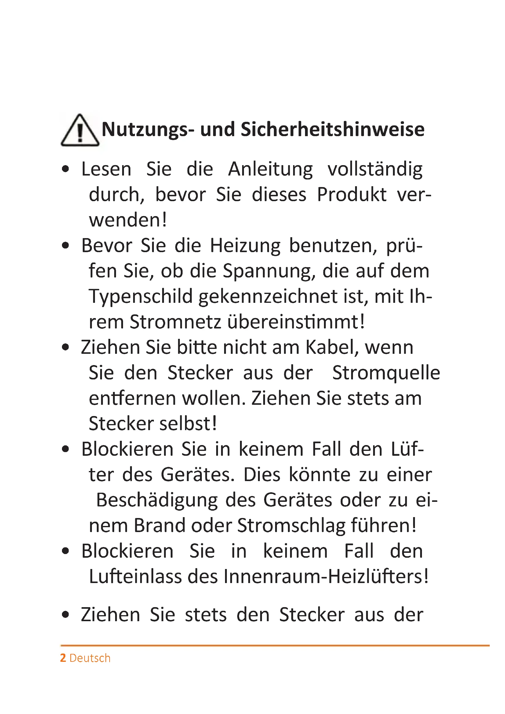 - Bevor Sie die Heizung benutzen, prüfen Sie, ob die Spannung, die auf dem Typenschild gekennzeichnet ist, mit ihrer Stromnetz übereinstimmt!