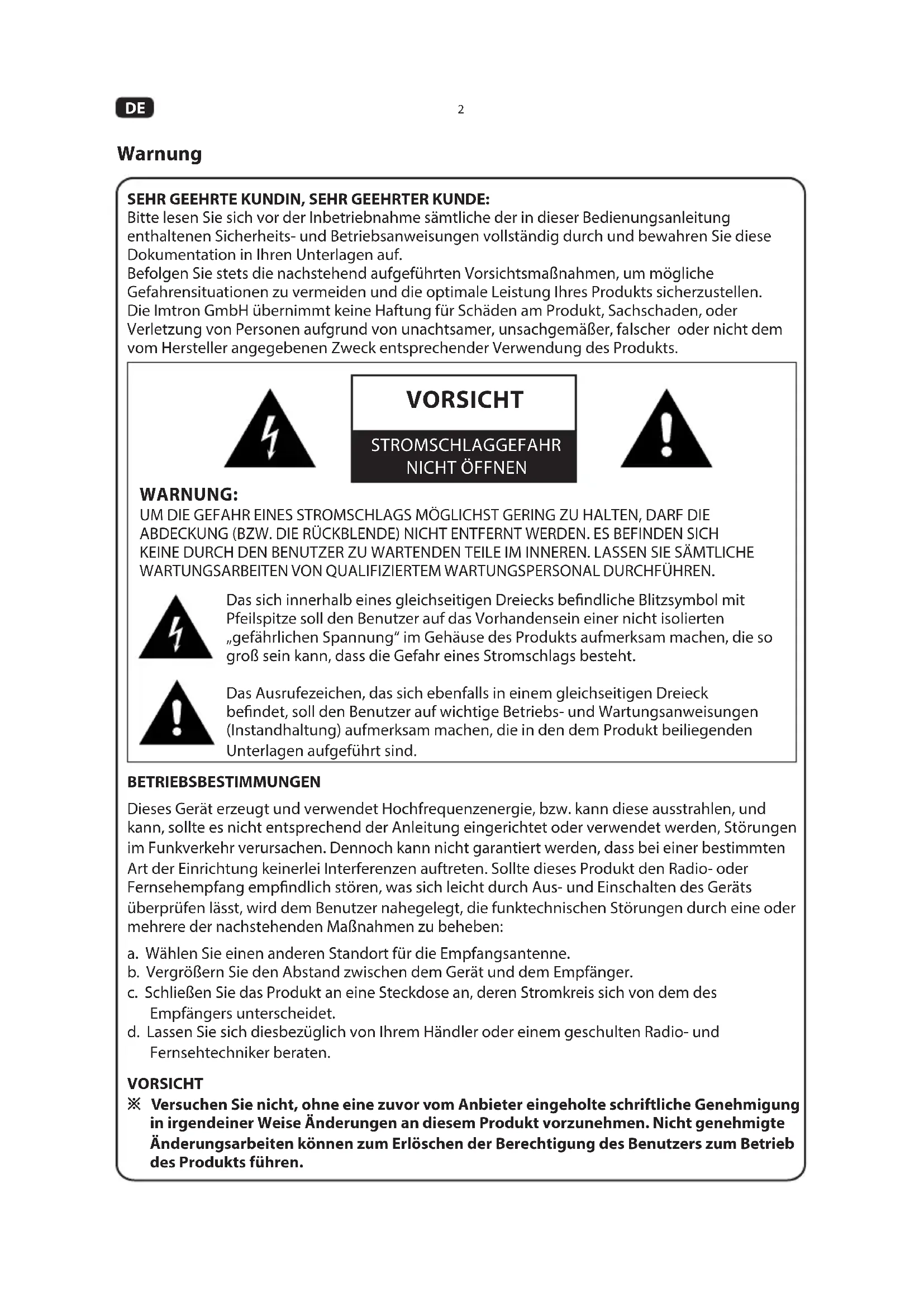 SEHR GEEHRTE KUNDIN, SEHR GEEHRTER KUNDE: Bitte lesen Sie sich vor der Inbetriebnahme sämtliche der in dieser Bedienungsanleitung enthaltenen Sicherheits- und Betriebsanweisungen vollständig durch und bewahren Sie diese Dokumentation in Ihren Unterlagen auf. Befolgen Sie stets die nachstehend aufgeführten Vorsichtsmaßnahmen, um mögliche Gefahrensituationen zu vermeiden und die optimale Leistung Ihres Produkts sicherzustellen. Die Imtron GmbH übernimmt keine Haftung für Schäden am Produkt, Sachschaden, oder Verletzung von Personen aufgrund von unachtsamer, unsachgemäßer, falscher oder nicht dem vom Hersteller angegebenen Zweck entsprechender Verwendung des Produkts. Warnung VORSICHT STROMSCHLAGGEFAHR NICHT ÖFFNEN WARNUNG: UM DIE GEFAHR EINES STROMSCHLAGS MÖGLICHST GERING ZU HALTEN, DARF DIE ABDECKUNG (BZW. DIE RÜCKBLENDE) NICHT ENTFERNT WERDEN. ES BEFINDEN SICH KEINE DURCH DEN BENUTZER ZU WARTENDEN TEILE IM INNEREN. LASSEN SIE SÄMTLICHE WARTUNGSARBEITEN VON QUALIFIZIERTEM WARTUNGSPERSONAL DURCHFÜHREN. Das sich innerhalb eines gleichseitigen Dreiecks bendliche Blitzsymbol mit Pfeilspitze soll den Benutzer auf das Vorhandensein einer nicht isolierten „gefährlichen Spannung“ im Gehäuse des Produkts aufmerksam machen, die so groß sein kann, dass die Gefahr eines Stromschlags besteht. Das Ausrufezeichen, das sich ebenfalls in einem gleichseitigen Dreieck bendet, soll den Benutzer auf wichtige Betriebs- und Wartungsanweisungen (Instandhaltung) aufmerksam machen, die in den dem Produkt beiliegenden Unterlagen aufgeführt sind. BETRIEBSBESTIMMUNGEN Dieses Gerät erzeugt und verwendet Hochfrequenzenergie, bzw. kann diese ausstrahlen, und kann, sollte es nicht entsprechend der Anleitung eingerichtet oder verwendet werden, Störungen im Funkverkehr verursachen. Dennoch kann nicht garantiert werden, dass bei einer bestimmten Art der Einrichtung keinerlei Interferenzen auftreten. Sollte dieses Produkt den Radio- oder Fernsehempfang empndlich stören, was sich leicht durch Aus- und Einschalten des Geräts überprüfen lässt, wird dem Benutzer nahegelegt, die funktechnischen Störungen durch eine oder mehrere der nachstehenden Maßnahmen zu beheben: a. Wählen Sie einen anderen Standort für die Empfangsantenne. b. Vergrößern Sie den Abstand zwischen dem Gerät und dem Empfänger. c. Schließen Sie das Produkt an eine Steckdose an, deren Stromkreis sich von dem des Empfängers unterscheidet. d. Lassen Sie sich diesbezüglich von Ihrem Händler oder einem geschulten Radio- und Fernsehtechniker beraten. VORSICHT ※ Versuchen Sie nicht, ohne eine zuvor vom Anbieter eingeholte schriftliche Genehmigung in irgendeiner Weise Änderungen an diesem Produkt vorzunehmen. Nicht genehmigte Änderungsarbeiten können zum Erlöschen der Berechtigung des Benutzers zum Betrieb des Produkts führen.DE
