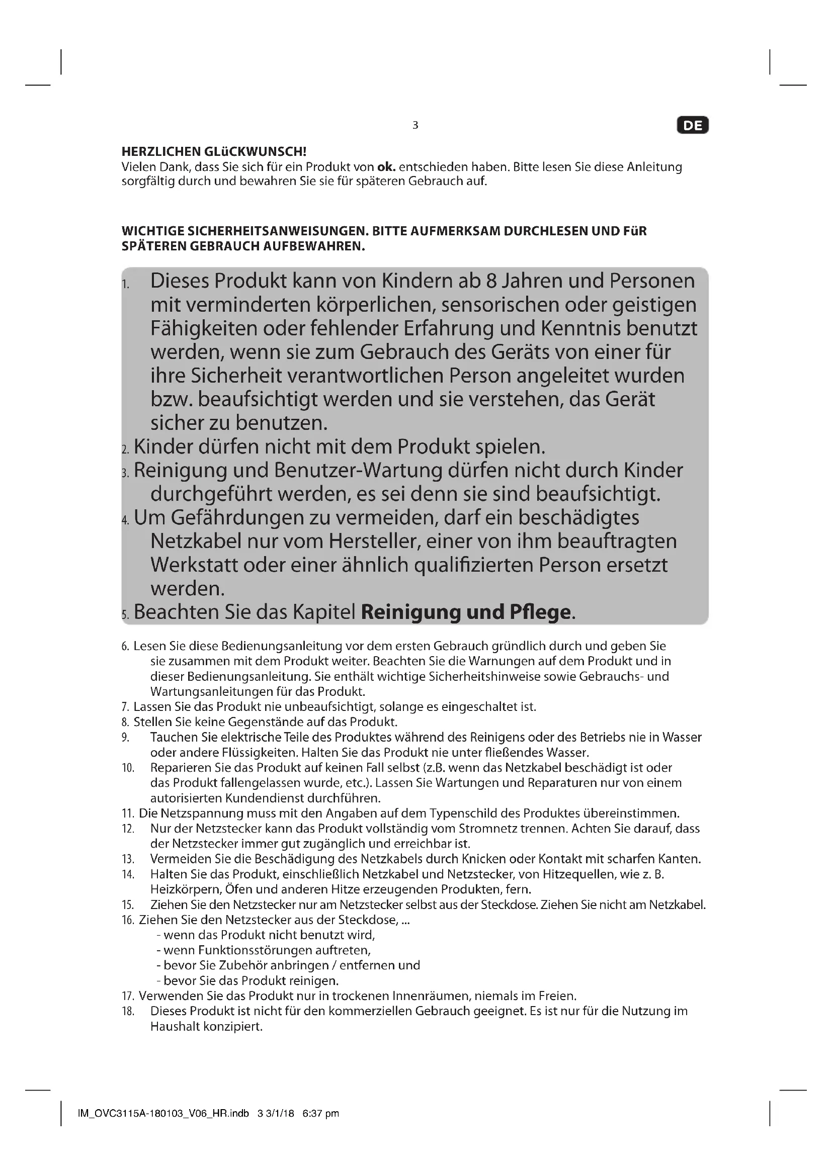 - Siehe Website unten für detaillierte technische Informationen oder bitten Sie den Händler um ein technisches Datenblatt. www.ok-online.com ENTSORGUNG Das Produkt nicht im Hausmüll entsorgen. Das Produkt ist an den ausgewiesenen Sammelstellen für elektrische und elektronische Geräte zu entsorgen. Für weitere Informationen wenden Sie sich bitte an Ihren Händler oder die zuständige Behörde am Ort. IM_OVC3115A-180103_V06_HR.indb 6 3/1/18 6:37 pm7