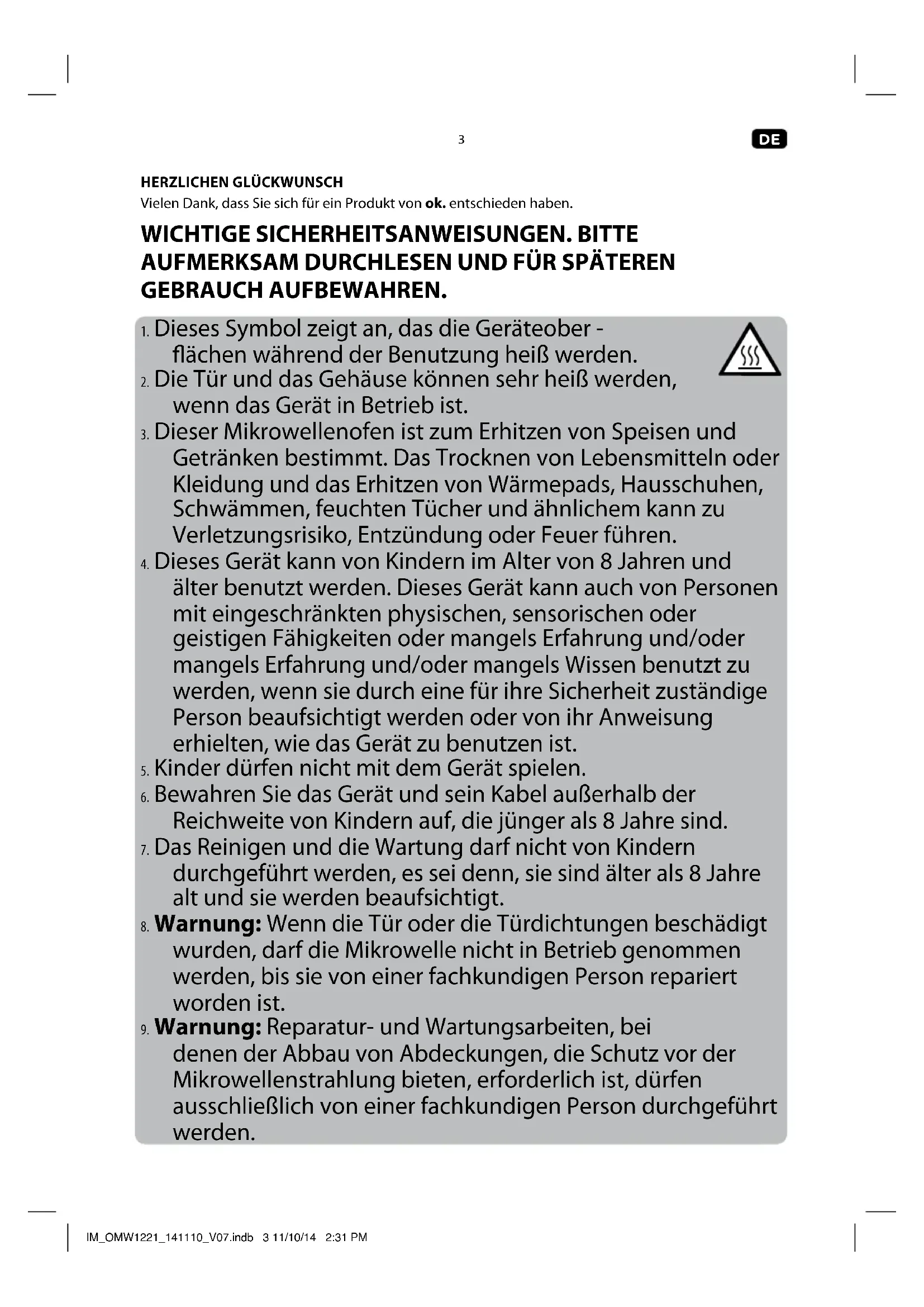 - Warnung: Nicht bestimmungsgemäße Verwendung des Schukosteckers kann zu Stromschlaggefahr führen. IM_OMW1221_141110_V07.indb 8 11/10/14 2:31 PM9