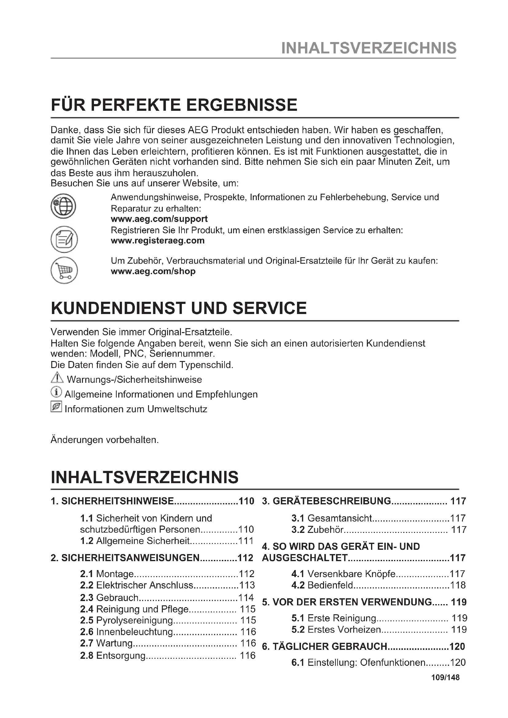 Danke, dass Sie sich für dieses AEG Produkt entschieden haben. Wir haben es geschaffen, damit Sie viele Jahre von seiner ausgezeichneten Leistung und den innovativen Technologien, die Ihnen das Leben erleichtern, profitieren können. Es ist mit Funktionen ausgestattet, die in gewöhnlichen Geräten nicht vorhanden sind. Bitte nehmen Sie sich ein paar Minuten Zeit, um das Beste aus ihm herauszuholen. Besuchen Sie uns auf unserer Website, um: Anwendungshinweise, Prospekte, Informationen zu Fehlerbehebung, Service und Reparatur zu erhalten: www.aeg.com/support Registrieren Sie Ihr Produkt, um einen erstklassigen Service zu erhalten: www.registeraeg.com Um Zubehör, Verbrauchsmaterial und Original-Ersatzteile für Ihr Gerät zu kaufen: www.aeg.com/shop