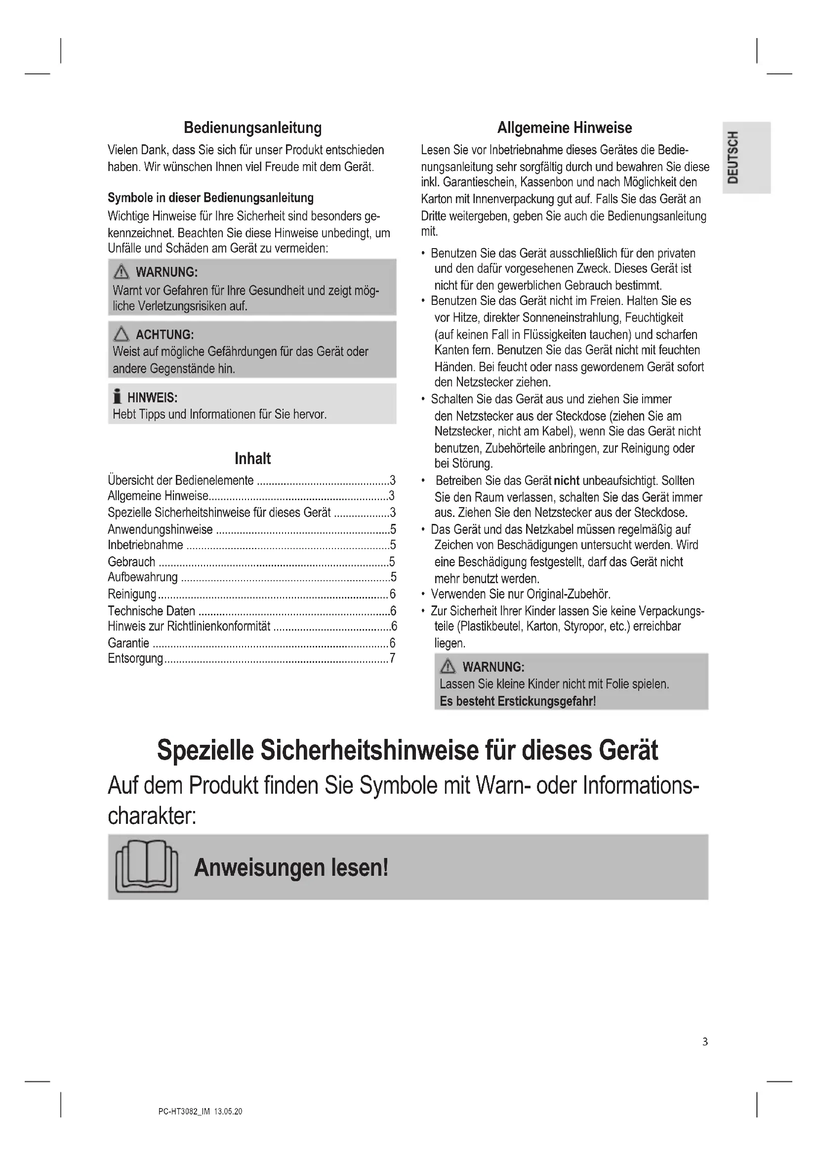 BEDIENUNGSANLEITUNG PCHT 3082 ProfiCare