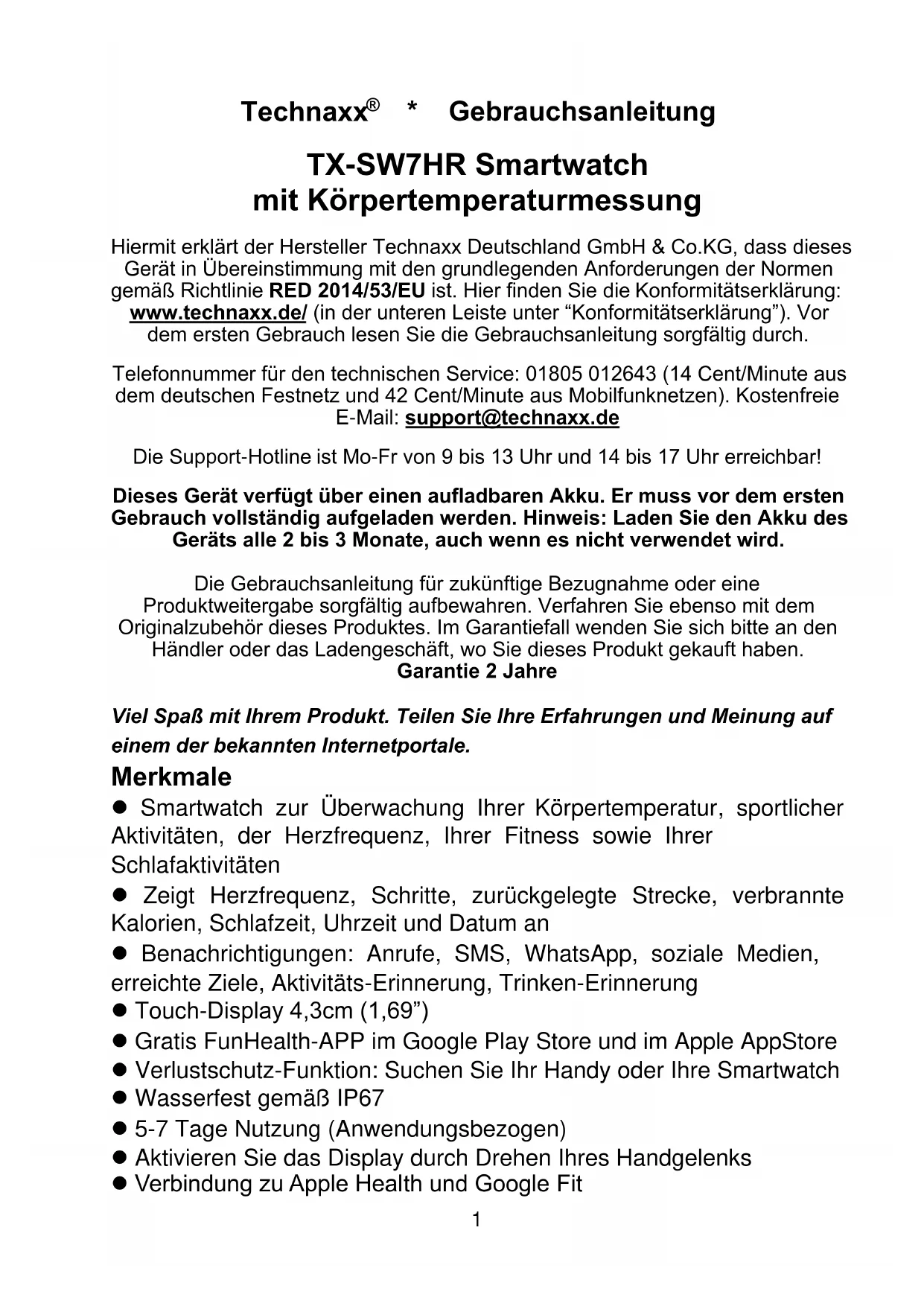 | Lieferinhalt | Technaxx® Smartwatch TX-SW7HR, USB-Ladekabel, Gebrauchsanleitung | ||