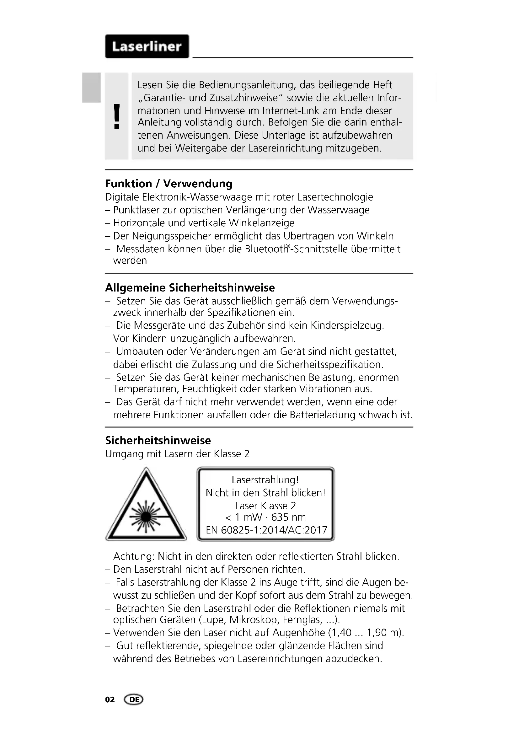 -Schnittstelle übermittelt werden Sicherheitshinweise Umgang mit Lasern der Klasse 2 Allgemeine Sicherheitshinweise – Setzen Sie das Gerät ausschließlich gemäß dem Verwendungs- zweck innerhalb der Spezikationen ein. – Die Messgeräte und das Zubehör sind kein Kinderspielzeug. Vor Kindern unzugänglich aufbewahren. – Umbauten oder Veränderungen am Gerät sind nicht gestattet, dabei erlischt die Zulassung und die Sicherheitsspezikation. – Setzen Sie das Gerät keiner mechanischen Belastung, enormen Temperaturen, Feuchtigkeit oder starken Vibrationen aus. – Das Gerät darf nicht mehr verwendet werden, wenn eine oder mehrere Funktionen ausfallen oder die Batterieladung schwach ist. – Achtung: Nicht in den direkten oder reektierten Strahl blicken. – Den Laserstrahl nicht auf Personen richten. – Falls Laserstrahlung der Klasse 2 ins Auge trifft, sind die Augen be- wusst zu schließen und der Kopf sofort aus dem Strahl zu bewegen. – Betrachten Sie den Laserstrahl oder die Reektionen niemals mit optischen Geräten (Lupe, Mikroskop, Fernglas, ...). – Verwenden Sie den Laser nicht auf Augenhöhe (1,40 ... 1,90 m). – Gut reektierende, spiegelnde oder glänzende Flächen sind während des Betriebes von Lasereinrichtungen abzudecken. Laserstrahlung! Nicht in den Strahl blicken! Laser Klasse 2 < 1 mW · 635 nm EN 60825-1:2014/AC:2017DigiLevel Pro 40/60/80/100/120