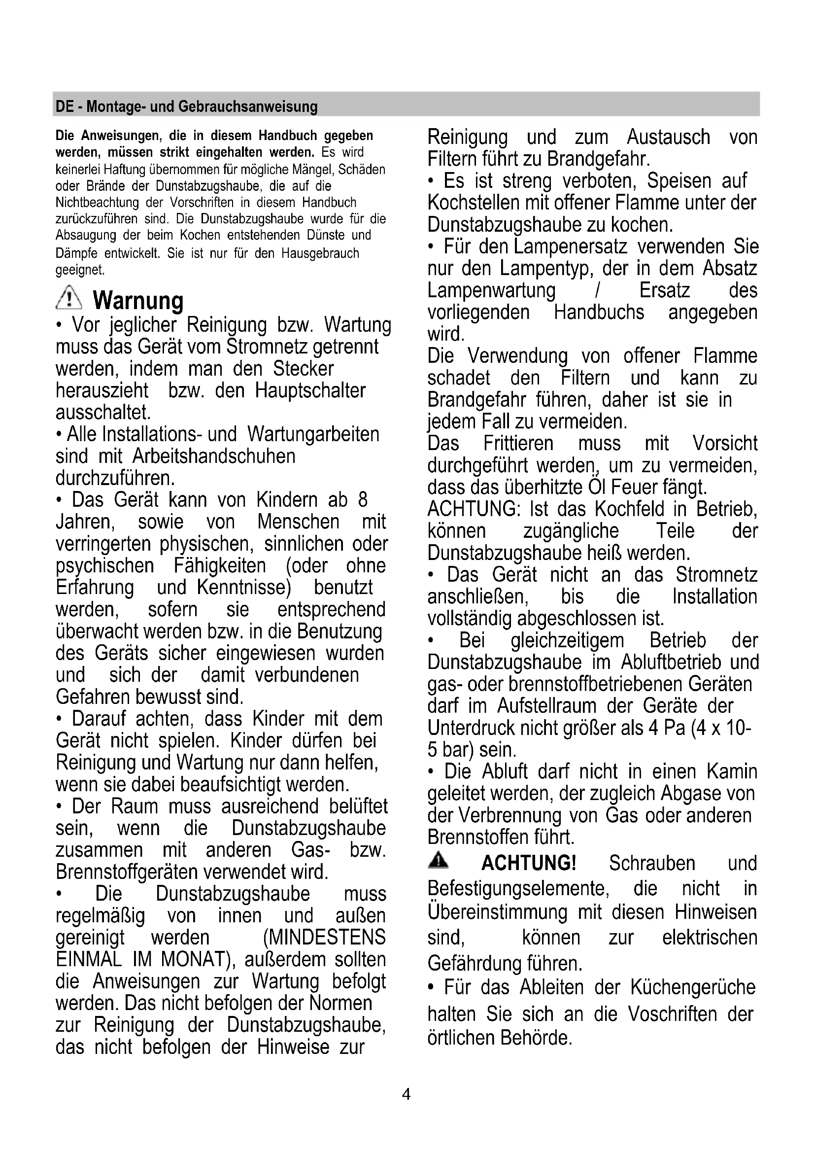 DE - Montage- und Gebrauchsanweisung Die Anweisungen, die in diesem Handbuch gegeben werden, müssen strikt eingehalten werden. Es wird keinerlei Haftung übernommen für mögliche Mängel, Schäden oder Brände der Dunstabzugshaube, die auf die Nichtbeachtung der Vorschriften in diesem Handbuch zurückzuführen sind. Die Dunstabzugshaube wurde für die Absaugung der beim Kochen entstehenden Dünste und Dämpfe entwickelt. Sie ist nur für den Hausgebrauch geeignet. Warnung