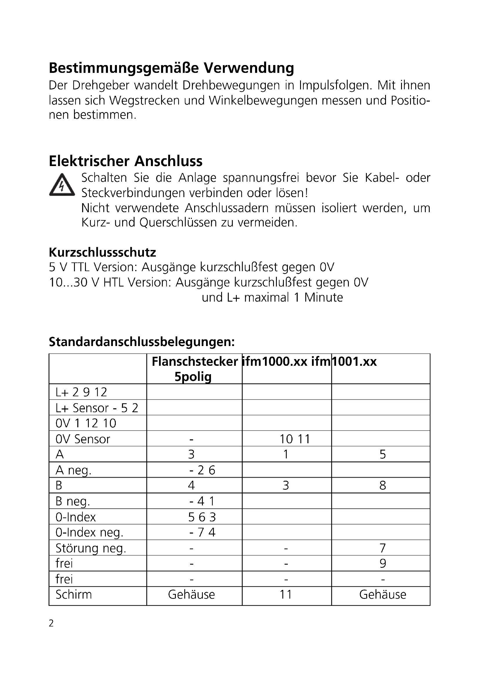 Flanschstecker ifm1000.xx ifm1001.xx 5polig L+ 2 9 12 L+ Sensor - 5 2 0V 1 12 10 0V Sensor - 10 11 A315 A neg. - 2 6 B438 B neg. - 4 1 0-Index 5 6 3 0-Index neg. - 7 4 Störung neg. - - 7 frei - - 9 frei - - - Schirm Gehäuse 11 GehäuseDie Anschlusbelegung finden Sie zusätzlich auf der Gehäusekappe. Bei Abweichungen muss der Anschluss gemäß des Aufklebers auf der Gehäusekappe vorgenommen werden. Die Anschlüsse L+ (Sensor) und 0V (Sensor) sind intern mit der Versor- gungsspannung verbunden. Bei Verwendung von Folgeelektroniken, die die Versorgungsspannung nachregeln, können diese Anschlüsse als Prüfleitungen verwendet werden. Bei Nichtverwendung sind diese Anschlüsse mit der Versorgungsspannung zu verbinden oder zu isolie- ren. Der elektrische Anschluss erfolgt je nach Ausführung über die Anschlussleitung oder separat erhältlichen Anschlussleitungen. Bei Verwendung von geeigneten Verbindungsleitungen beträgt die maximale Leitungslänge für die 5 V TTL Version 100 m und für die 10...30 V HTL Version 300 m.