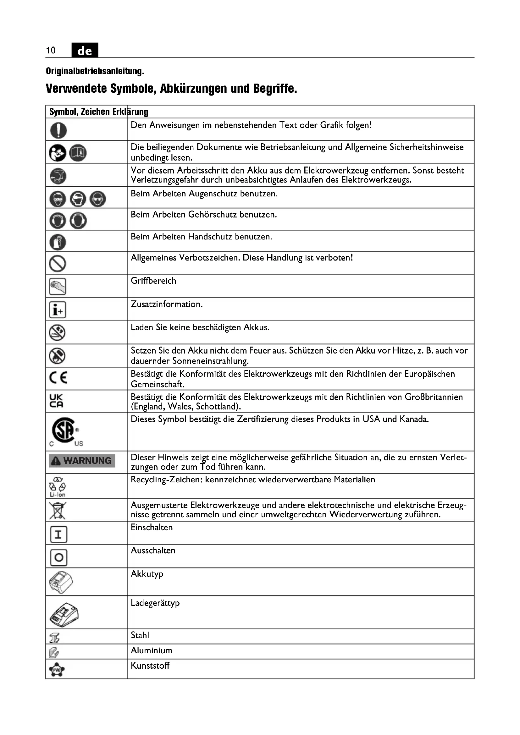 Originalbetriebsanleitung.Übersetzung der Originalbetriebsanleitung. Verwendete Symbole, Abkürzungen und Begriffe. Symbol, Zeichen Erklärung Den Anweisungen im nebenstehenden Text oder Grafik folgen! Die beiliegenden Dokumente wie Betriebsanleitung und Allgemeine Sicherheitshinweise unbedingt lesen. Vor diesem Arbeitsschritt den Akku aus dem Elektrowerkzeug entfernen. Sonst besteht Verletzungsgefahr durch unbeabsichtigtes Anlaufen des Elektrowerkzeugs. Beim Arbeiten Augenschutz benutzen. Beim Arbeiten Gehörschutz benutzen. Beim Arbeiten Handschutz benutzen. Allgemeines Verbotszeichen. Diese Handlung ist verboten! Griffbereich Zusatzinformation. Laden Sie keine beschädigten Akkus. Setzen Sie den Akku nicht dem Feuer aus. Schützen Sie den Akku vor Hitze, z. B. auch vor dauernder Sonneneinstrahlung. Bestätigt die Konformität des Elektrowerkzeugs mit den Richtlinien der Europäischen Gemeinschaft. Bestätigt die Konformität des Elektrowerkzeugs mit den Richtlinien von Großbritannien (England, Wales, Schottland). Dieses Symbol bestätigt die Zertifizierung dieses Produkts in USA und Kanada. Dieser Hinweis zeigt eine möglicherweise gefährliche Situation an, die zu ernsten Verlet- zungen oder zum Tod führen kann. Recycling-Zeichen: kennzeichnet wiederverwertbare Materialien Ausgemusterte Elektrowerkzeuge und andere elektrotechnische und elektrische Erzeug- nisse getrennt sammeln und einer umweltgerechten Wiederverwertung zuführen. Einschalten Ausschalten Akkutyp Ladegerättyp Stahl Aluminium Kunststoff WARNUNG11