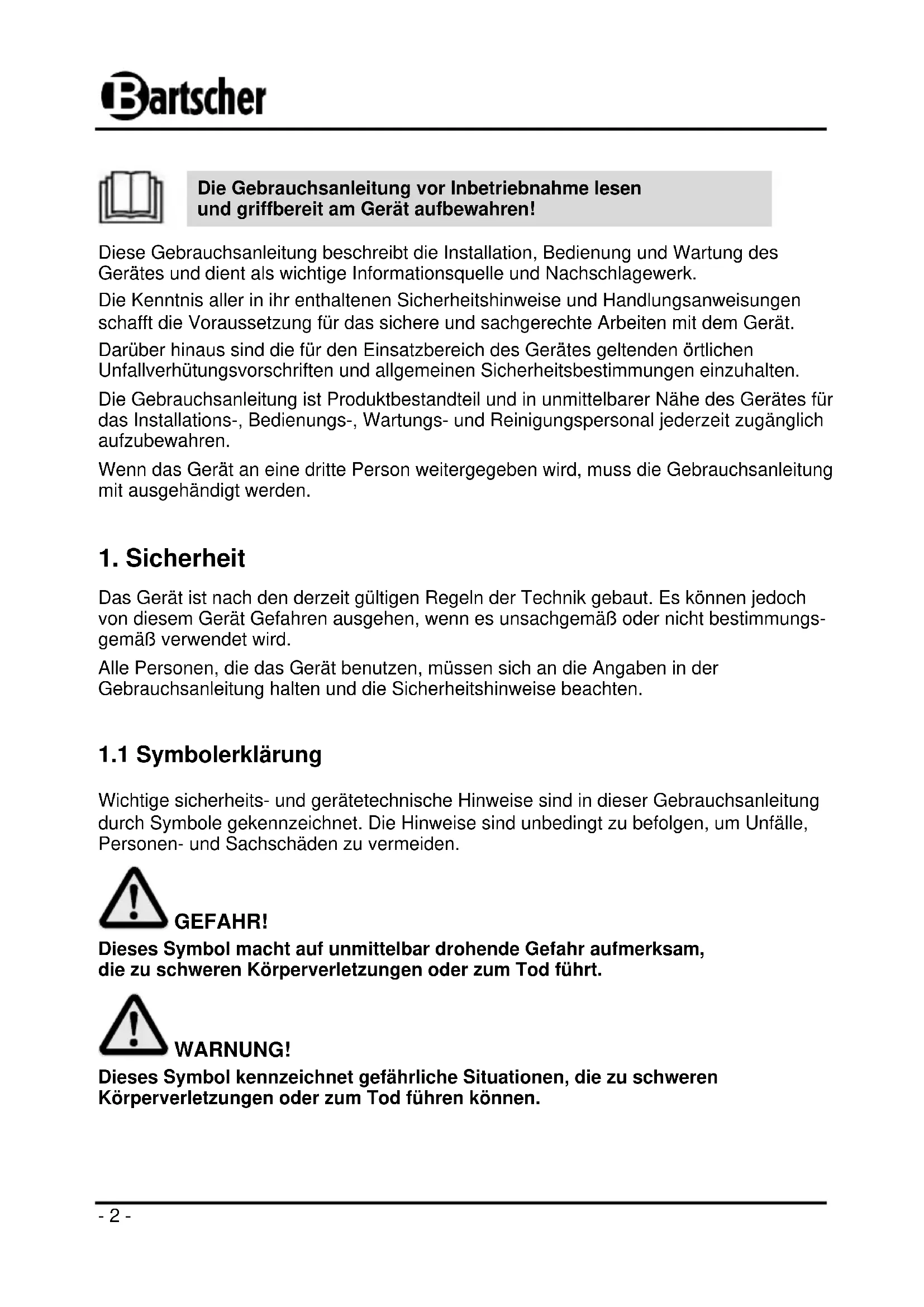 Die Gebrauchsanleitung vor Inbetriebnahme lesen und griffbereit am Gerät aufbewahren!