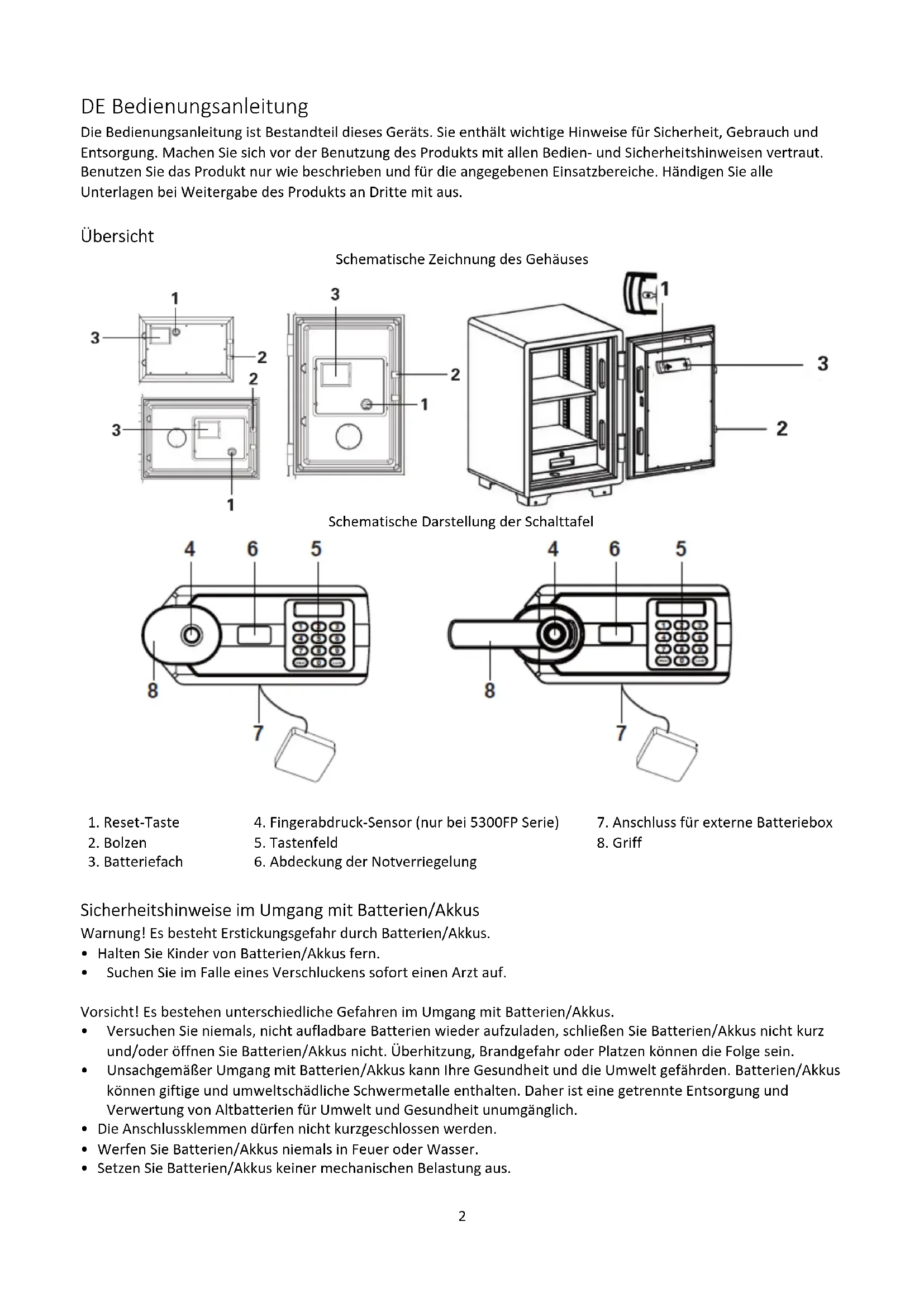 - 1x Bedienungsanleitung Einrichten Den Tresor zum ersten Mal öffnen / Den Tresor mit dem Notschlüssel öffnen: Variante 1: Öffnen durch externe Stromzufuhr Legen Sie die Batterien in den externen Batteriekasten ein. Schließen Sie die externe Batteriebox an die Tresorschnittstelle an (siehe "Schematische Darstellung des Bedienfeldes") Tresor mit Benutzercode/Fingerabdruck (nur bei 5300FP Serie) öffnen Variante 2: