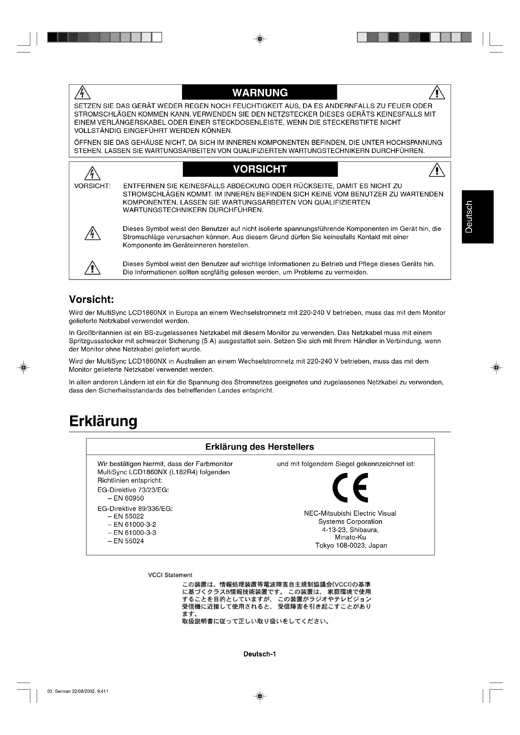 - NepouÏívejte primárnû modrou barvu na tmavém pozadí; je ‰patnû vidût a zpÛsobuje únavu oãí v dÛsledku nedostateãného kontrastu. 02_Czech 22/08/2002, 9:4110Deutsch Deutsch-1 Erklärung Erklärung des Herstellers Wir bestätigen hiermit, dass der Farbmonitor MultiSync LCD1860NX (L182R4) folgenden Richtlinien entspricht: EG-Direktive 73/23/EG: – EN 60950 EG-Direktive 89/336/EG: – EN 55022 – EN 61000-3-2 – EN 61000-3-3 – EN 55024 und mit folgendem Siegel gekennzeichnet ist: NEC-Mitsubishi Electric Visual Systems Corporation 4-13-23, Shibaura, Minato-Ku Tokyo 108-0023, Japan Vorsicht: Wird der MultiSync LCD1860NX in Europa an einem Wechselstromnetz mit 220-240 V betrieben, muss das mit dem Monitor gelieferte Netzkabel verwendet werden. In Großbritannien ist ein BS-zugelassenes Netzkabel mit diesem Monitor zu verwenden. Das Netzkabel muss mit einem Spritzgussstecker mit schwarzer Sicherung (5 A) ausgestattet sein. Setzen Sie sich mit Ihrem Händler in Verbindung, wenn der Monitor ohne Netzkabel geliefert wurde. Wird der MultiSync LCD1860NX in Australien an einem Wechselstromnetz mit 220-240 V betrieben, muss das mit dem Monitor gelieferte Netzkabel verwendet werden. In allen anderen Ländern ist ein für die Spannung des Stromnetzes geeignetes und zugelassenes Netzkabel zu verwenden, dass den Sicherheitsstandards des betreffenden Landes entspricht. SETZEN SIE DAS GERÄT WEDER REGEN NOCH FEUCHTIGKEIT AUS, DA ES ANDERNFALLS ZU FEUER ODER STROMSCHLÄGEN KOMMEN KANN. VERWENDEN SIE DEN NETZSTECKER DIESES GERÄTS KEINESFALLS MIT EINEM VERLÄNGERSKABEL ODER EINER STECKDOSENLEISTE, WENN DIE STECKERSTIFTE NICHT VOLLSTÄNDIG EINGEFÜHRT WERDEN KÖNNEN. ÖFFNEN SIE DAS GEHÄUSE NICHT, DA SICH IM INNEREN KOMPONENTEN BEFINDEN, DIE UNTER HOCHSPANNUNG STEHEN. LASSEN SIE WARTUNGSARBEITEN VON QUALIFIZIERTEN WARTUNGSTECHNIKERN DURCHFÜHREN. WARNUNG VORSICHT VORSICHT: ENTFERNEN SIE KEINESFALLS ABDECKUNG ODER RÜCKSEITE, DAMIT ES NICHT ZU STROMSCHLÄGEN KOMMT. IM INNEREN BEFINDEN SICH KEINE VOM BENUTZER ZU WARTENDEN