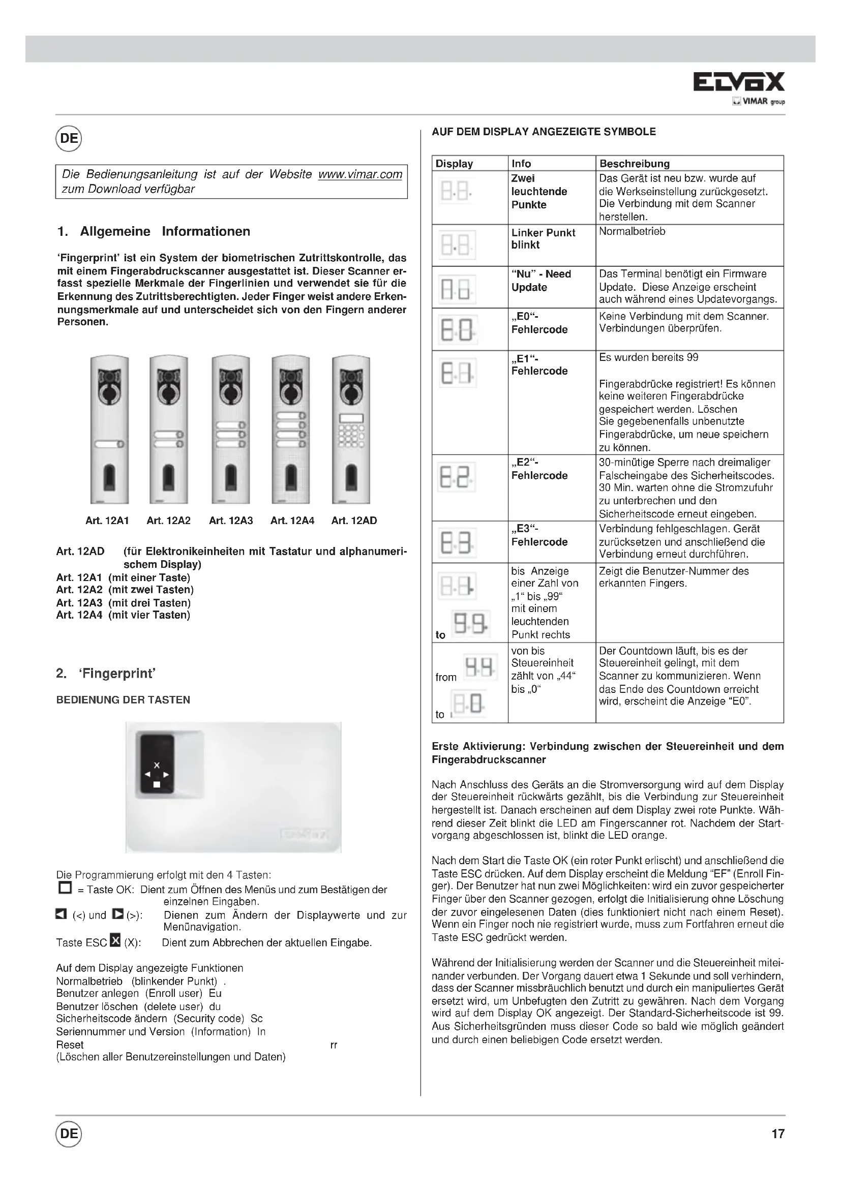 ‘Fingerprint’ ist ein System der biometrischen Zutrittskontrolle, das mit einem Fingerabdruckscanner ausgestattet ist. Dieser Scanner er- fasst spezielle Merkmale der Fingerlinien und verwendet sie für die Erkennung des Zutrittsberechtigten. Jeder Finger weist andere Erken- nungsmerkmale auf und unterscheidet sich von den Fingern anderer Personen. Art. 12AD (für Elektronikeinheiten mit Tastatur und alphanumeri- schem Display) Art. 12A1 (mit einer Taste) Art. 12A2 (mit zwei Tasten) Art. 12A3 (mit drei Tasten) Art. 12A4 (mit vier Tasten) Art. 12A1 Art. 12A2 Art. 12A3 Art. 12A4 Art. 12AD