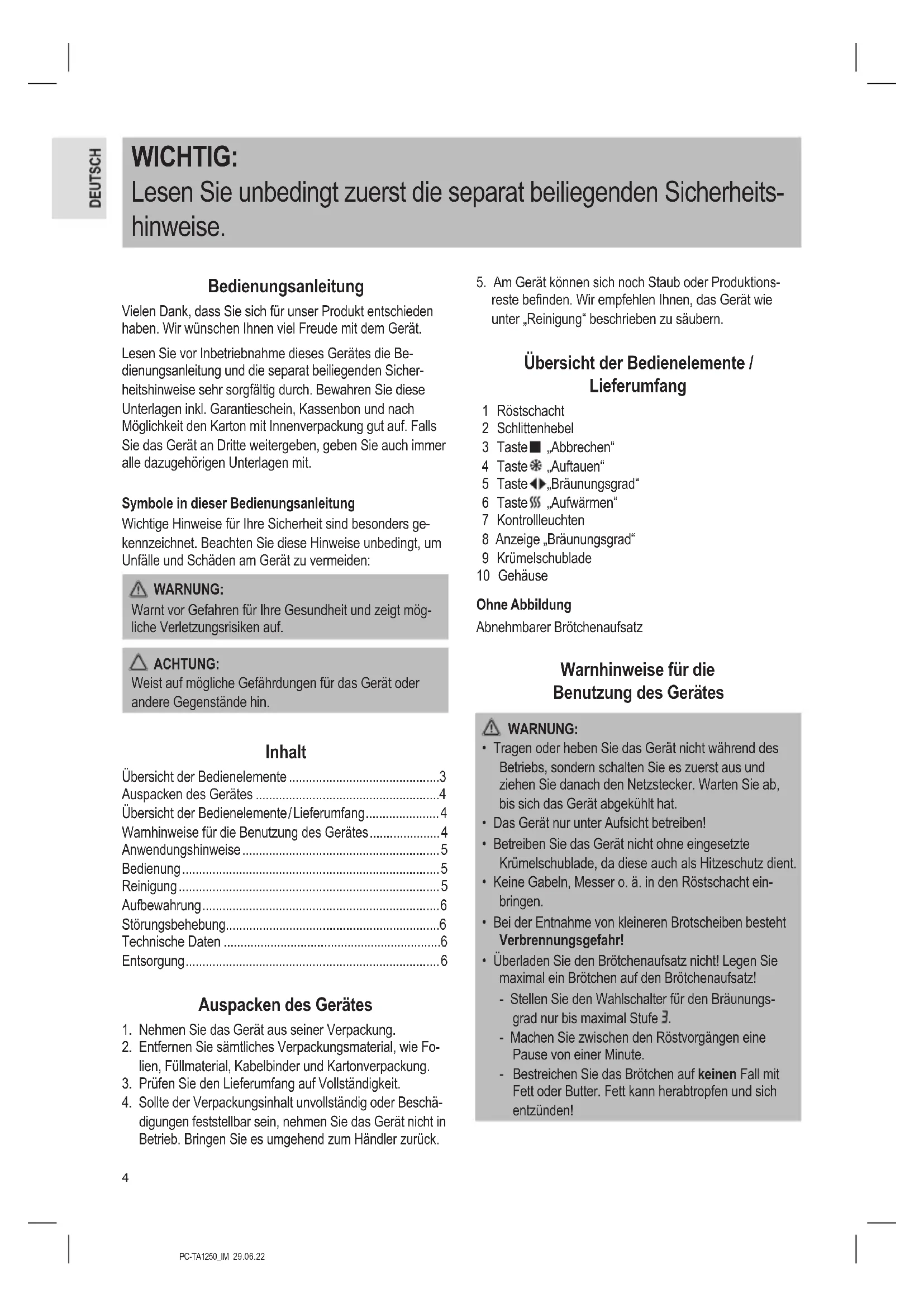 PCTA 1250 - Toaster PROFICOOK - Kostenlose Bedienungsanleitung