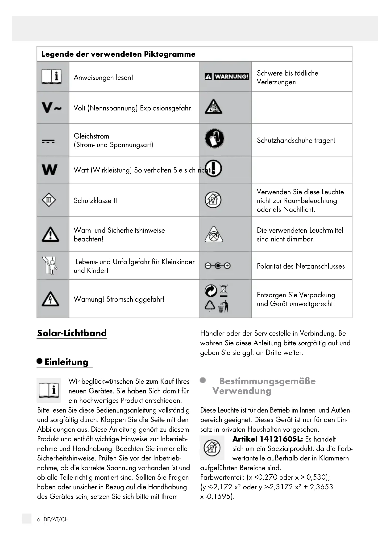 Entsorgen Sie Verpackung und Gerät umweltgerecht! Solar-Lichtband Einleitung Wir beglückwünschen Sie zum Kauf Ihres neuen Gerätes. Sie haben Sich damit für ein hochwertiges Produkt entschieden. Bitte lesen Sie diese Bedienungsanleitung vollständig und sorgfältig durch. Klappen Sie die Seite mit den Abbildungen aus. Diese Anleitung gehört zu diesem Produkt und enthält wichtige Hinweise zur Inbetrieb- nahme und Handhabung. Beachten Sie immer alle Sicherheitshinweise. Prüfen Sie vor der Inbetrieb- nahme, ob die korrekte Spannung vorhanden ist und ob alle Teile richtig montiert sind. Sollten Sie Fragen haben oder unsicher in Bezug auf die Handhabung des Gerätes sein, setzen Sie sich bitte mit Ihrem Händler oder der Servicestelle in Verbindung. Be- wahren Sie diese Anleitung bitte sorgfältig auf und geben Sie sie ggf. an Dritte weiter. Bestimmungsgemäße Verwendung Diese Leuchte ist für den Betrieb im Innen- und Außen- bereich geeignet. Dieses Gerät ist nur für den Ein- satz in privaten Haushalten vorgesehen. Artikel 14121605L: Es handelt sich um ein Spezialprodukt, da die Farb- wertanteile außerhalb der in Klammern aufgeführten Bereiche sind. Farbwertanteil: (x <0,270 oder x > 0,530); (y <-2,172 x² oder y >-2,3172 x² + 2,3653 x -0,1595).7 DE/AT/CH Lieferumfang Kontrollieren Sie unmittelbar nach dem Auspacken immer den Lieferumfang auf Vollständigkeit sowie den einwandfreien Zustand des Gerätes. 1 Solar-Lichtband, Modell 14121605L und 14121705L mit Dämmerungsssensor 1 Solarpanel 4 Silikonringe 1 Standrohr 1 Erdspieß 1 Bedienungsanleitung Teilebeschreibung