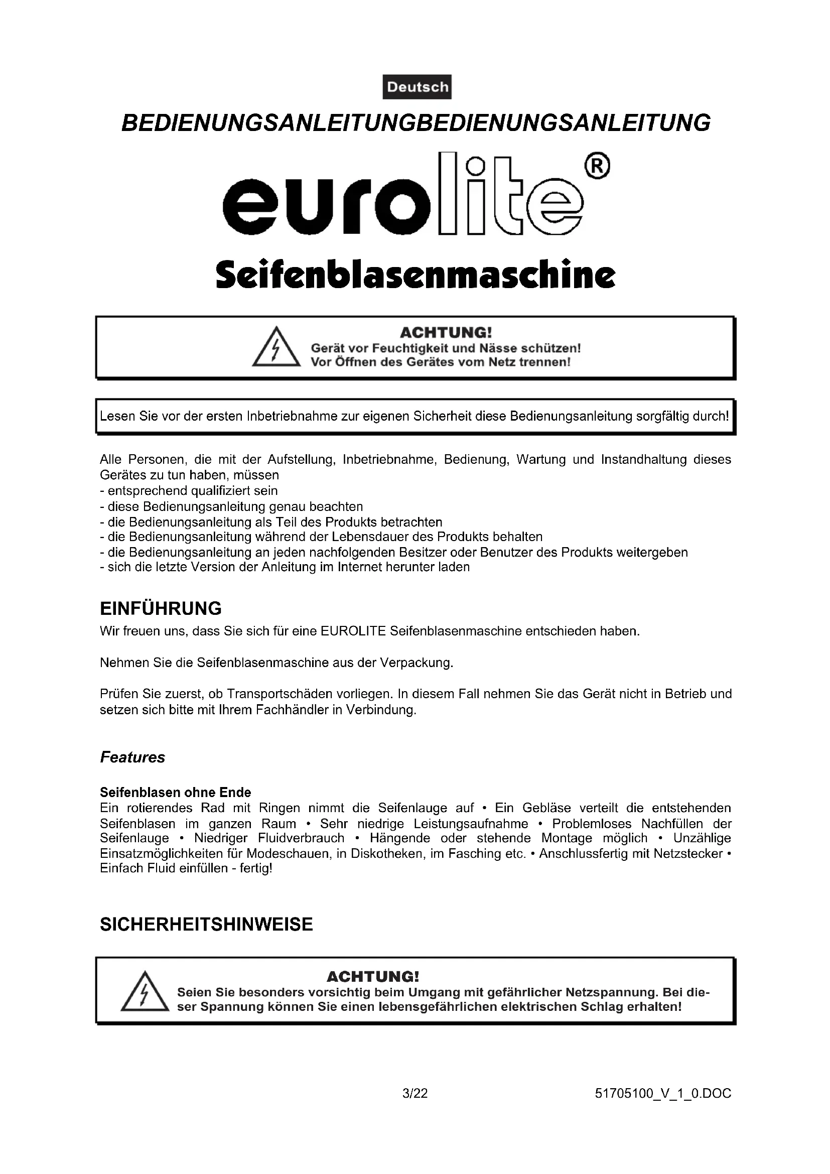 - ESPECIFICACIONES TÉCNICAS Das neueste Update dieser Bedienungsanleitung finden Sie im Internet unter: You can find the latest update of this user manual in the Internet under: Vous pouvez trouvez la dernière version de ce mode d'emploi dans l'Internet sous: Vd. puede encontrar la versión más reciente de este manual en el Internet bajo: www.eurolite.de51705100_V_1_0.DOC 3/22 BEDIENUNGSANLEITUNGBEDIENUNGSANLEITUNG Seifenblasenmaschine Lesen Sie vor der ersten Inbetriebnahme zur eigenen Sicherheit diese Bedienungsanleitung sorgfältig durch! Alle Personen, die mit der Aufstellung, Inbetriebnahme, Bedienung, Wartung und Instandhaltung dieses Gerätes zu tun haben, müssen- entsprechend qualifiziert sein- diese Bedienungsanleitung genau beachten- die Bedienungsanleitung als Teil des Produkts betrachten- die Bedienungsanleitung während der Lebensdauer des Produkts behalten- die Bedienungsanleitung an jeden nachfolgenden Besitzer oder Benutzer des Produkts weitergeben- sich die letzte Version der Anleitung im Internet herunter laden EINFÜHRUNG Wir freuen uns, dass Sie sich für eine EUROLITE Seifenblasenmaschine entschieden haben.Nehmen Sie die Seifenblasenmaschine aus der Verpackung.Prüfen Sie zuerst, ob Transportschäden vorliegen. In diesem Fall nehmen Sie das Gerät nicht in Betrieb undsetzen sich bitte mit Ihrem Fachhändler in Verbindung. Features Seifenblasen ohne Ende Ein rotierendes Rad mit Ringen nimmt die Seifenlauge auf • Ein Gebläse verteilt die entstehenden Seifenblasen im ganzen Raum • Sehr niedrige Leistungsaufnahme • Problemloses Nachfüllen der Seifenlauge • Niedriger Fluidverbrauch • Hängende oder stehende Montage möglich • Unzählige Einsatzmöglichkeiten für Modeschauen, in Diskotheken, im Fasching etc. • Anschlussfertig mit Netzstecker • Einfach Fluid einfüllen - fertig! SICHERHEITSHINWEISE ACHTUNG! Seien Sie besonders vorsichtig beim Umgang mit gefährlicher Netzspannung. Bei die- ser Spannung können Sie einen lebensgefährlichen elektrischen Schlag erhalten!51705100_V_1_0.DOC 4/22 Dieses Gerät hat das Werk in sicherheitstechnisch einwandfreiem Zustand verlassen. Um diesen Zustand zu erhalten und einen gefahrlosen Betrieb sicherzustellen, muss der Anwender die Sicherheitshinweise und die Warnvermerke unbedingt beachten, die in dieser Bedienungsanleitung enthalten sind. Unbedingt lesen: Bei Schäden, die durch Nichtbeachtung der Anleitung verursacht werden, erlischt der Garantiean- spruch. Für daraus resultierende Folgeschäden übernimmt der Hersteller keine Haftung. Das Gerät darf nicht in Betrieb genommen werden, nachdem es von einem kalten in einen warmen Raum gebracht wurde. Das dabei entstehende Kondenswasser kann unter Umständen Ihr Gerät zerstören. Lassen Sie das Gerät solange uneingeschaltet, bis es Zimmertemperatur erreicht hat! Der Aufbau entspricht der Schutzklasse I. Der Netzstecker darf nur an eine Schutzkontakt-Steckdose angeschlossen werden. Den Netzstecker immer als letztes einstecken. Vergewissern Sie sich, dass der Netzschalter auf „OFF“ steht, wenn Sie das Gerät ans Netz anschließen. Lassen Sie die Netzleitung nicht mit anderen Kabeln in Kontakt kommen! Seien Sie vorsichtig beim Umgang mit Netzleitungen und -anschlüssen. Fassen Sie diese Teile nie mit nassen Händen an! Vergewissern Sie sich, dass die anzuschließende Netzspannung nicht höher ist als auf der Rückseite ange- geben. Stecken Sie die Netzleitung nur in geeignete Schukosteckdosen ein. Achten Sie darauf, dass die Netzleitung nicht gequetscht oder durch scharfe Kanten beschädigt werden kann. Überprüfen Sie das Gerät und die Netzleitung in regelmäßigen Abständen auf Beschädigungen. Flüssigkeit niemals trinken, einnehmen oder äußerlich anwenden! Von Kindern fernhalten und unzugänglich aufbewahren. Bei Haut-/Augenkontakt mit viel Wasser ab- bzw. ausspülen (ggf. einen Arzt aufsuchen). Achten Sie darauf, dass das Gerät stets aufrecht installiert ist. Bei Überkopfmontage (Montagehöhe >100 cm) ist das Gerät immer mit einem geeigneten Sicherheitsfang- seil zu sichern. Gerät bei Nichtbenutzung und vor jeder Reinigung vom Netz trennen! Fassen Sie dazu den Netzstecker an der Griffläche an und ziehen Sie niemals an der Netzleitung! Nicht im Gebrauch befindliche Geräte müssen allpolig spannungsfrei geschaltet werden! Sind Stecker oder Geräteschalter, z. B. durch Einbau nicht erreichbar, so muss netzseitig eine allpolige Abschaltung vorge- nommen werden. Kinder und Laien vom Gerät fern halten! Das Gerät darf niemals unbeaufsichtigt betrieben werden! p. 22