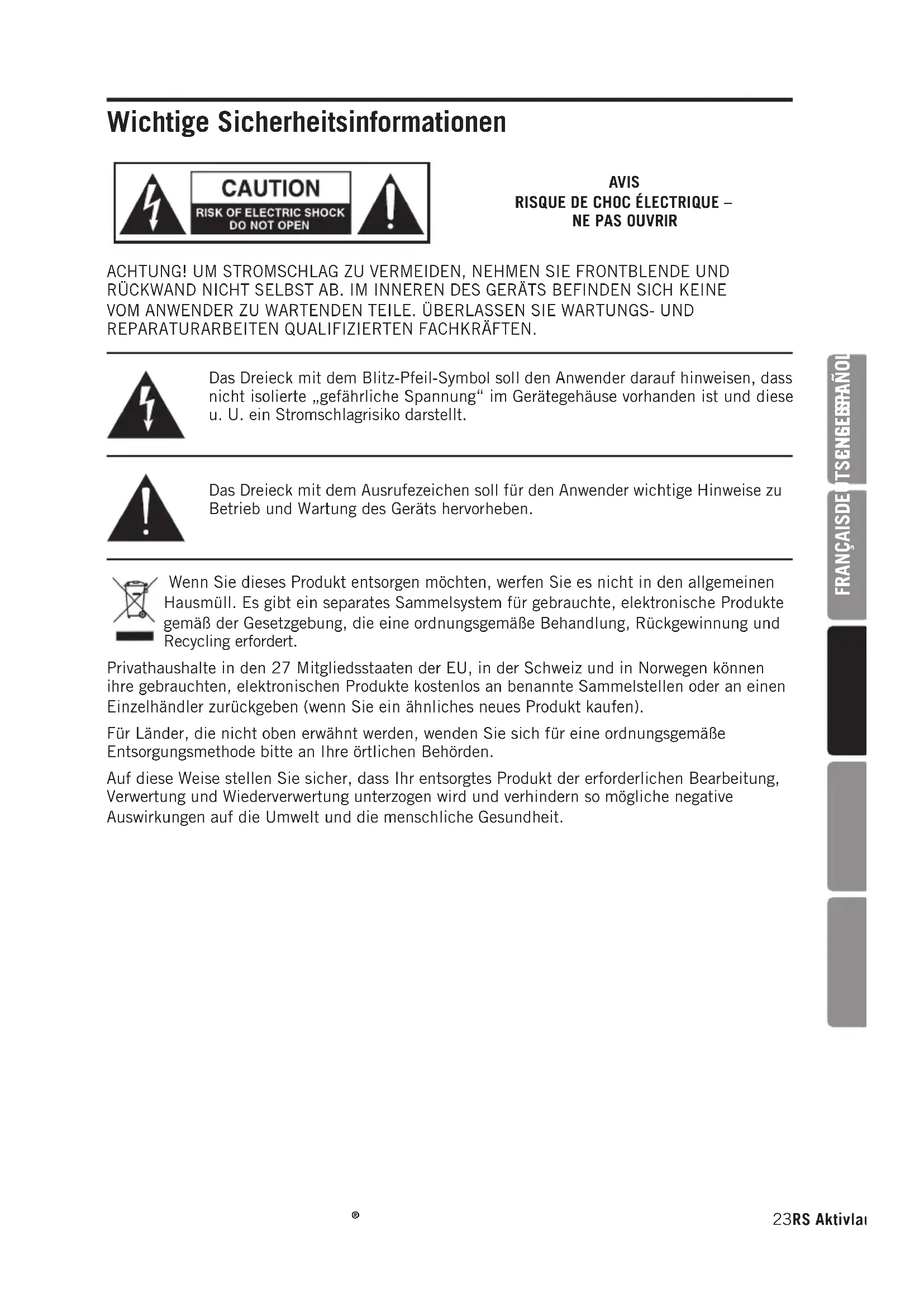 ACHTUNG! UM STROMSCHLAG ZU VERMEIDEN, NEHMEN SIE FRONTBLENDE UND RÜCKWAND NICT SELBST AB. IM INNEREN DES GERÄTS BEFINDEN SICH KEINE VOM ANWENDER ZU WARTENDED TEILE. ÜberLASSEN SIE WARTUNGS- UND REPARATURARBEITEN QUALIFIZIERTEM FACHKRAFTEN.
