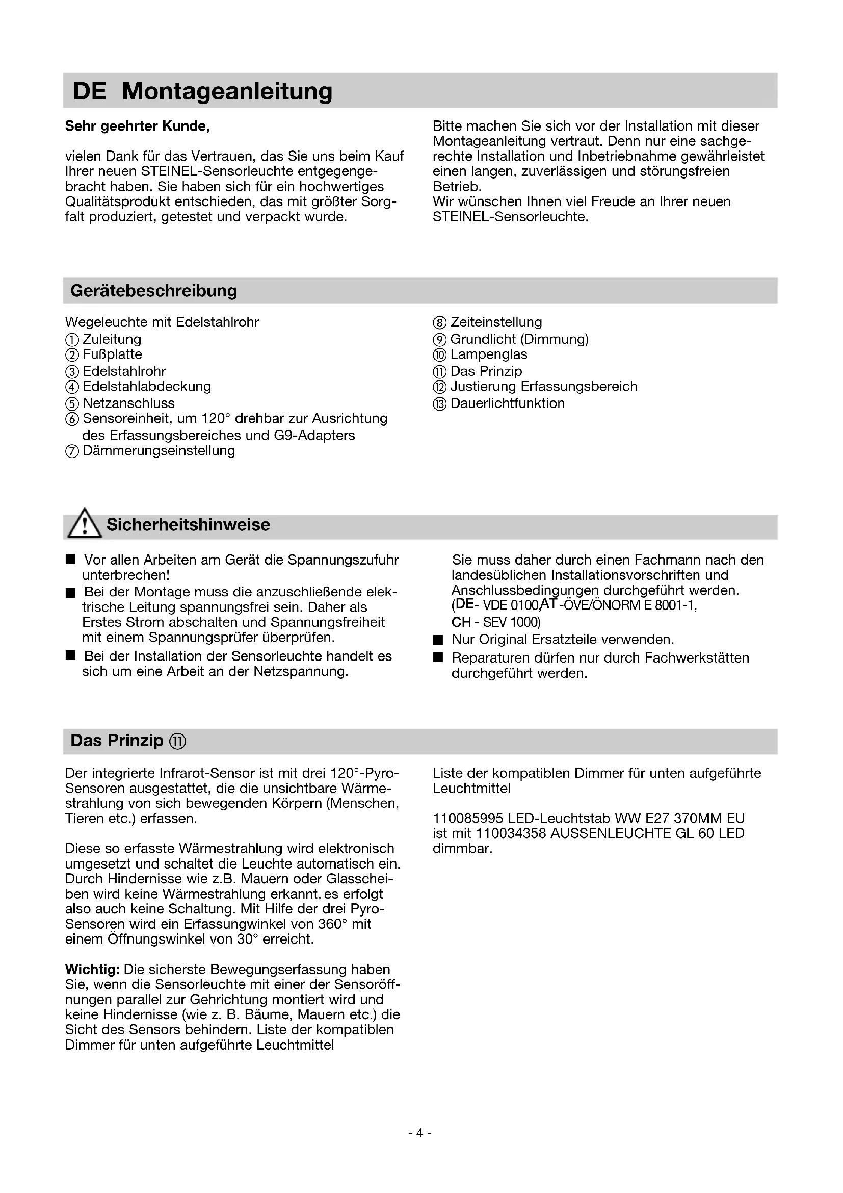 Bei der Installation der Sensorleuchte handelt es sich um eine Arbeit an der Netzspannung. Bitte machen Sie sich vor der Installation mit dieser Montageanleitung vertraut. Denn nur eine sachge- rechte Installation und Inbetriebnahme gewährleistet einen langen, zuverlässigen und störungsfreien Betrieb. Wir wünschen Ihnen viel Freude an Ihrer neuen STEINEL-Sensorleuchte. Sie muss daher durch einen Fachmann nach den landesüblichen Installationsvorschriften und Anschlussbedingungen durchgeführt werden.