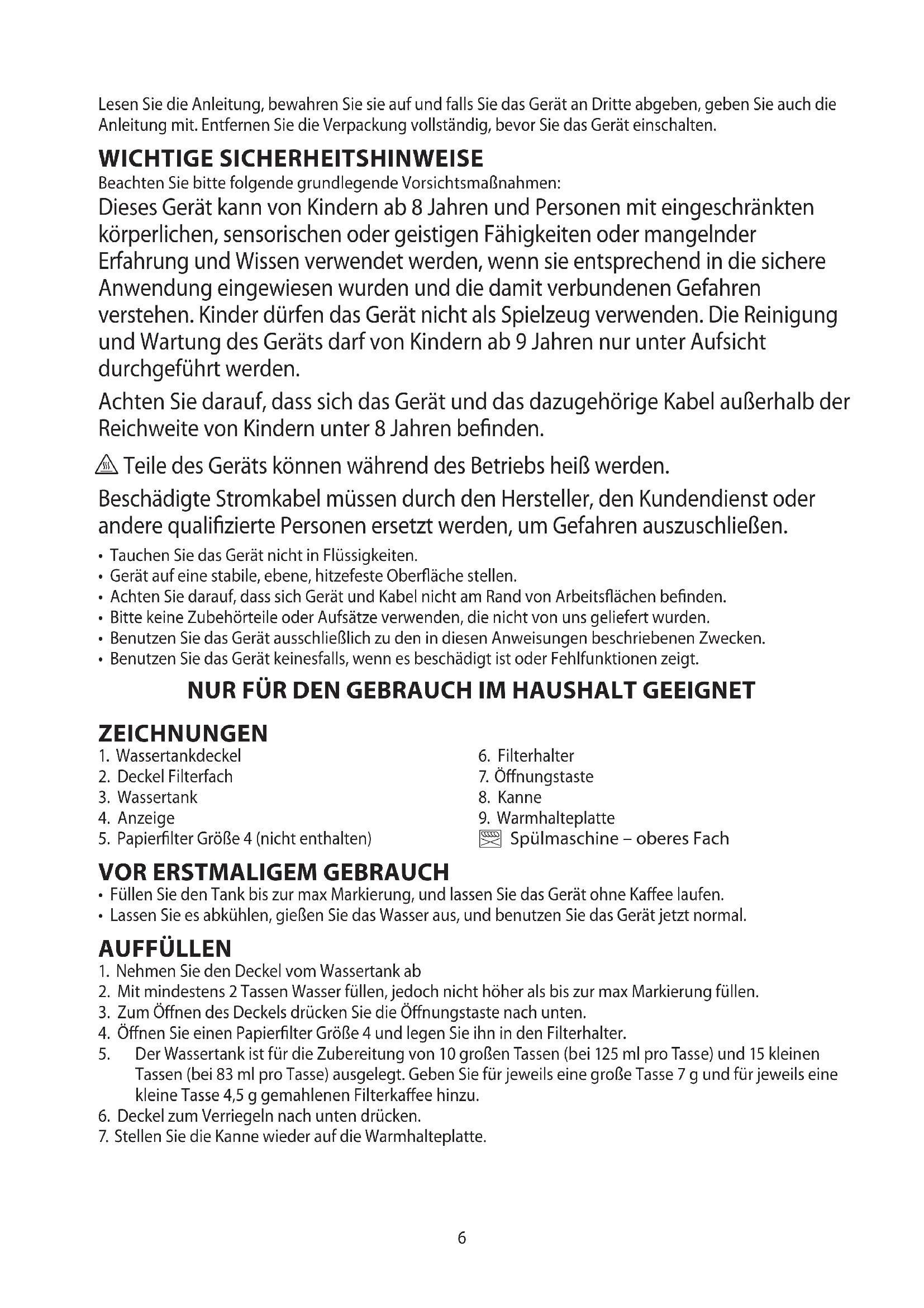 - Benutzen Sie das Gerät keinesfalls, wenn es beschädigt ist oder Fehlfunktionen zeigt. NUR FÜR DEN GEBRAUCH IM HAUSHALT GEEIGNET ZEICHNUNGEN