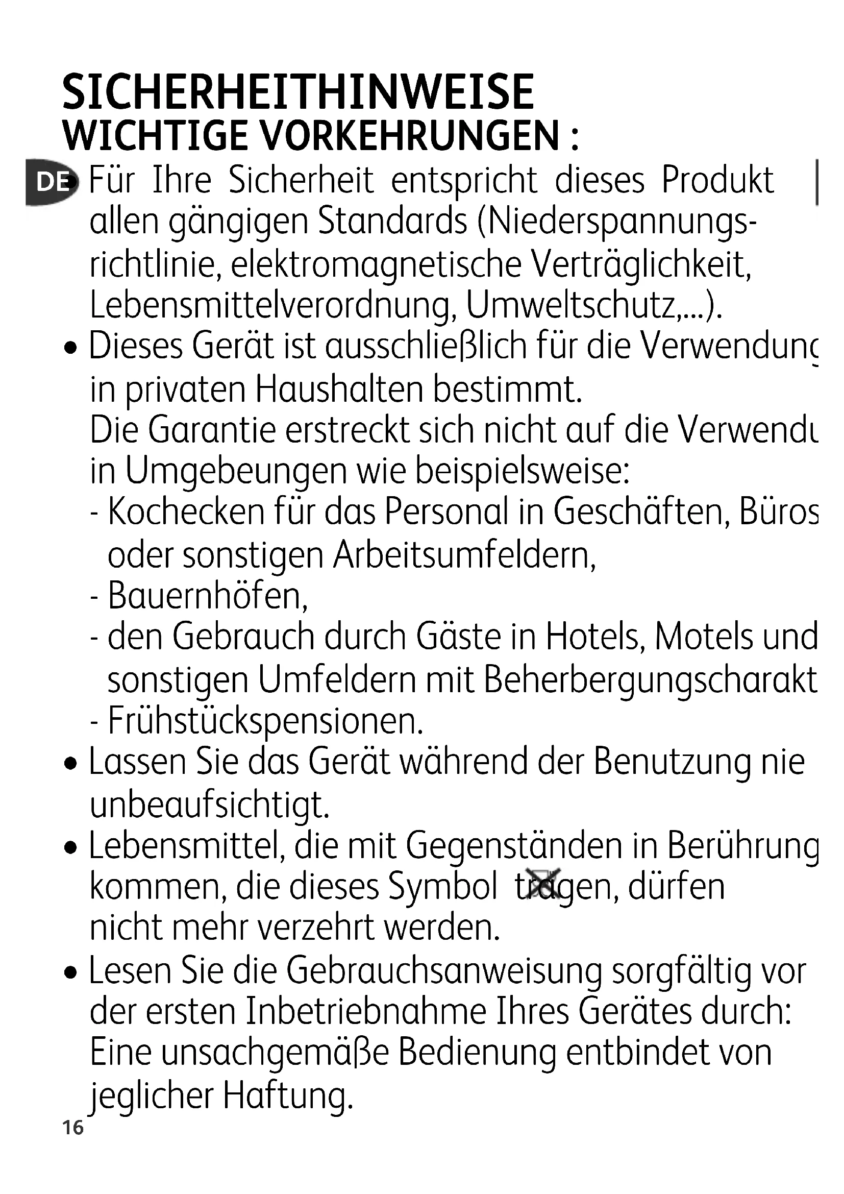 - Dieses Gerät ist ausschließlich für die Verwendung in privaten Haushalten bestimmt. Die Garantie erstreckt sich nicht auf die Verwendung in Umgebeungen wie beispielsweise: - Kochecken für das Personal in Geschäften, Büros oder sonstigen Arbeitsumfeldern, - Bauernhöfen, - den Gebrauch durch Gäste in Hotels, Motels und sonstigen Umfeldern mit Beherbergungscharakter, - Frühstückspensionen.