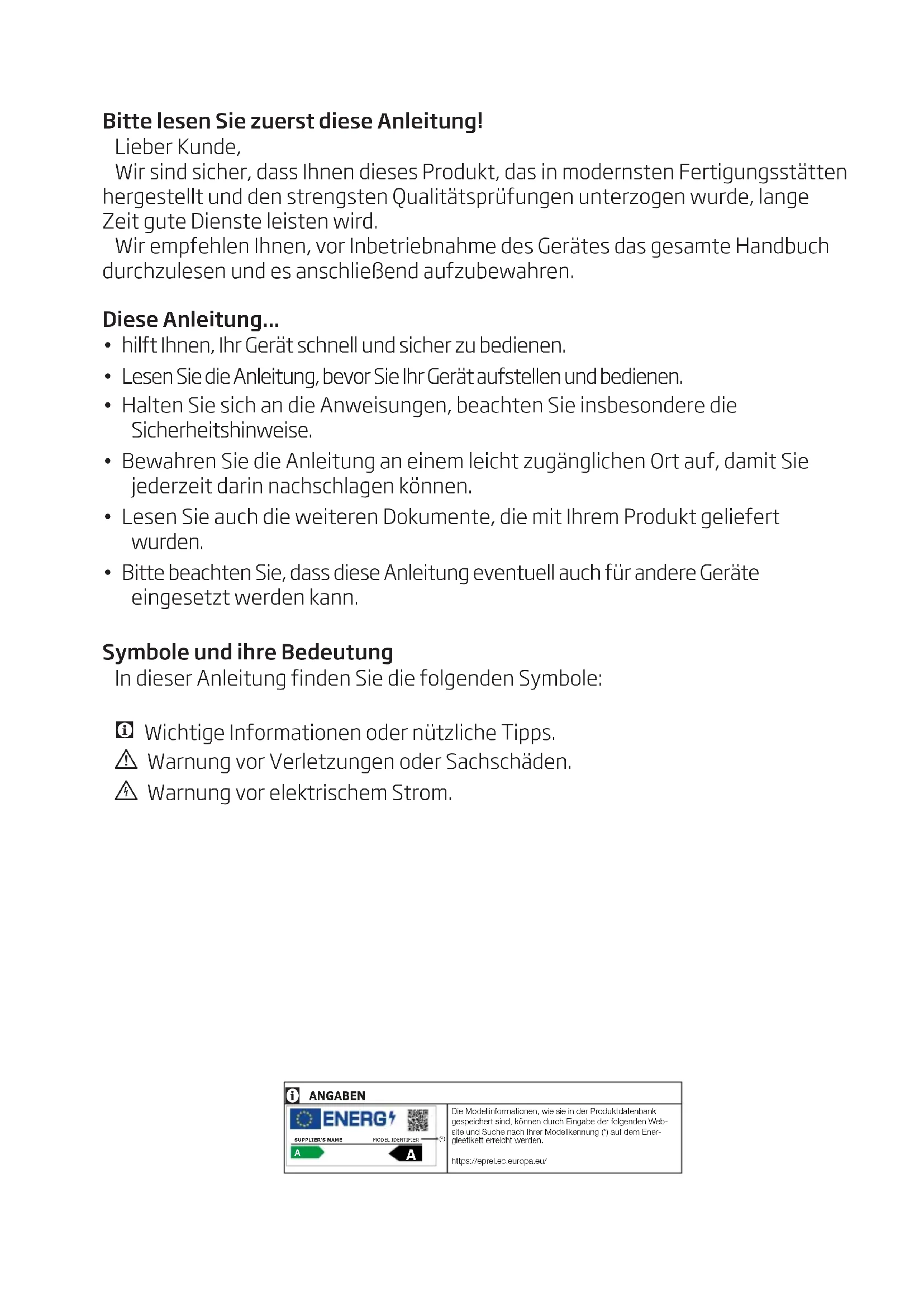 Die Modellinformationen, wie sie in der Produktdatenbank gespeichert sind, können durch Eingabe der folgenden Web-site und Suche nach Ihrer Modellkennung (*) auf dem Ener-gieetikett erreicht werden.https://eprel.ec.europa.eu/