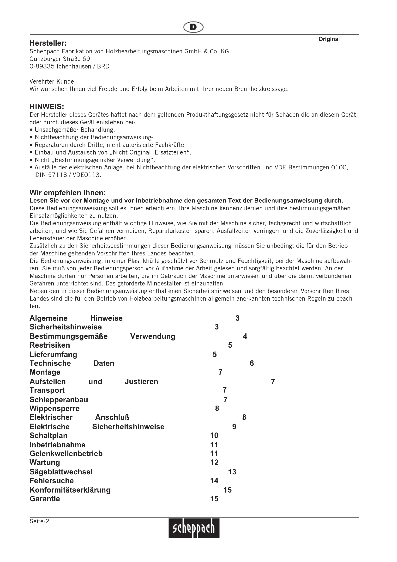 - Ausfälle der elektrischen Anlage. bei Nichtbeachtung der elektrischen Vorschriften und VDE-Bestimmungen 0100, DIN 57113 / VDE0113. Wir empfehlen Ihnen: Lesen Sie vor der Montage und vor Inbetriebnahme den gesamten Text der Bedienungsanweisung durch. Diese Bedienungsanweisung soll es Ihnen erleichtern, Ihre Maschine kennenzulernen und ihre bestimmungsgemäßen Einsatzmöglichkeiten zu nutzen. Die Bedienungsanweisung enthält wichtige Hinweise, wie Sie mit der Maschine sicher, fachgerecht und wirtschaftlich arbeiten, und wie Sie Gefahren vermeiden, Reparaturkosten sparen, Ausfallzeiten verringern und die Zuverlässigkeit und Lebensdauer der Maschine erhöhen. Zusätzlich zu den Sicherheitsbestimmungen dieser Bedienungsanweisung müssen Sie unbedingt die für den Betrieb der Maschine geltenden Vorschriften Ihres Landes beachten. Die Bedienungsanweisung, in einer Plastikhülle geschützt vor Schmutz und Feuchtigkeit, bei der Maschine aufbewah- ren. Sie muß von jeder Bedienungsperson vor Aufnahme der Arbeit gelesen und sorgfältig beachtet werden. An der Maschine dürfen nur Personen arbeiten, die im Gebrauch der Maschine unterwiesen und über die damit verbundenen Gefahren unterrichtet sind. Das geforderte Mindestalter ist einzuhalten. Neben den in dieser Bedienungsanweisung enthaltenen Sicherheitshinweisen und den besonderen Vorschriften Ihres Landes sind die für den Betrieb von Holzbearbeitungsmaschinen allgemein anerkannten technischen Regeln zu beach- ten. Original Algemeine Hinweise 3 Sicherheitshinweise 3 Bestimmungsgemäße Verwendung 4 Restrisiken 5 Lieferumfang 5 Technische Daten 6 Montage 7 Aufstellen und Justieren 7 Transport 7 Schlepperanbau 7 Wippensperre 8 Elektrischer Anschluß 8 Elektrische Sicherheitshinweise 9 Schaltplan 10 Inbetriebnahme 11 Gelenkwellenbetrieb 11 Wartung 12 Sägeblattwechsel 13 Fehlersuche 14 Konformitätserklärung 15 Garantie 15Seite:3 Algemeine Hinweise