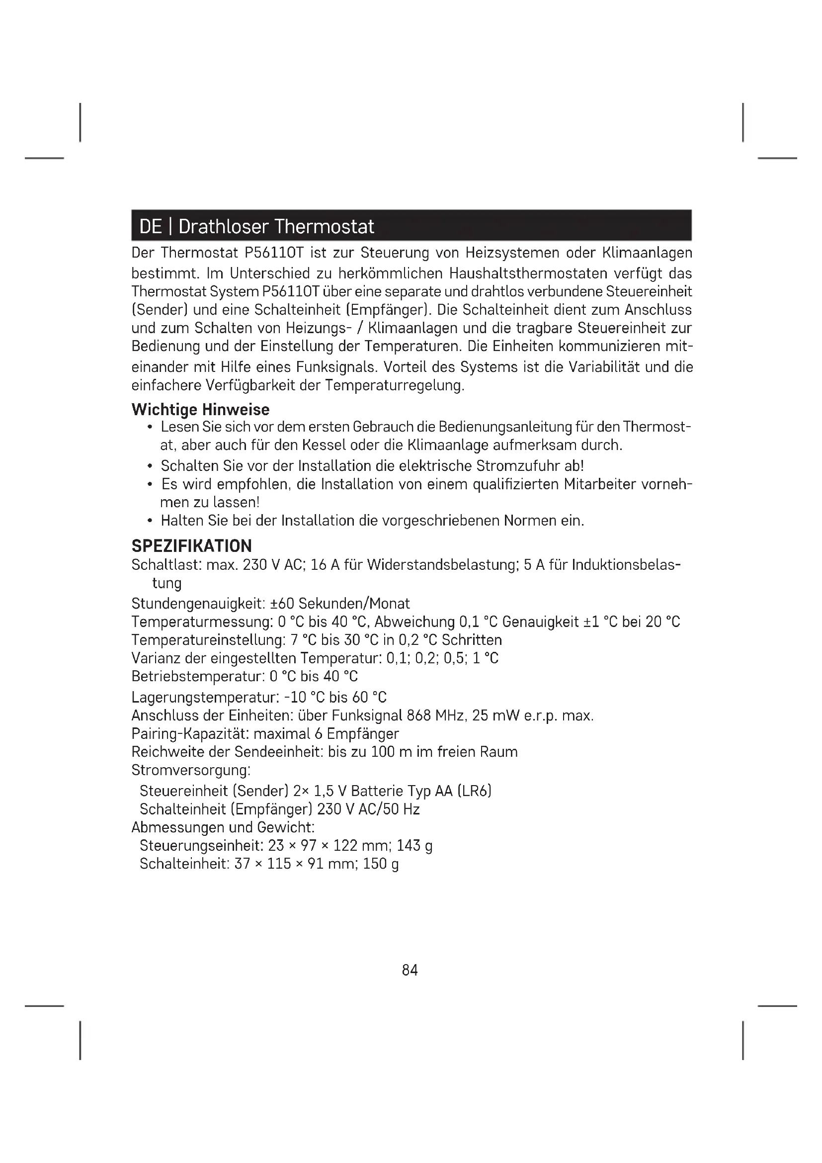 Die Reichweite zwischen der Steuer- und Schalteinheit beträgt max. 100 m im oenen Raum. In Innenräumen kann die Reichweite infolge von Signalblockierungen durch Wände und andere Hindernisse geringer sein.