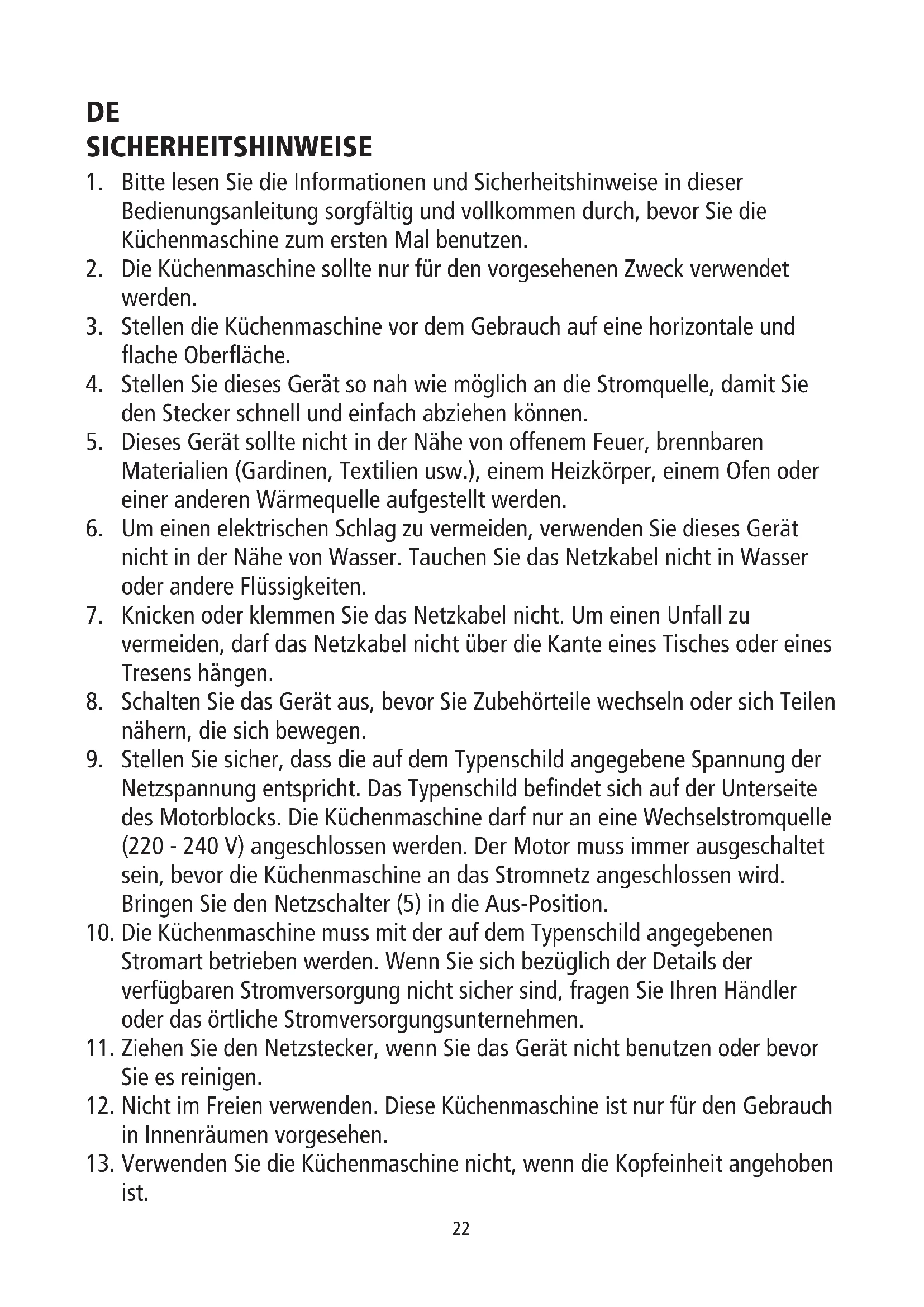 13. Verwenden Sie die Kuchenmaschine nicht, wenn die Kopfeinheit angehoben ist.