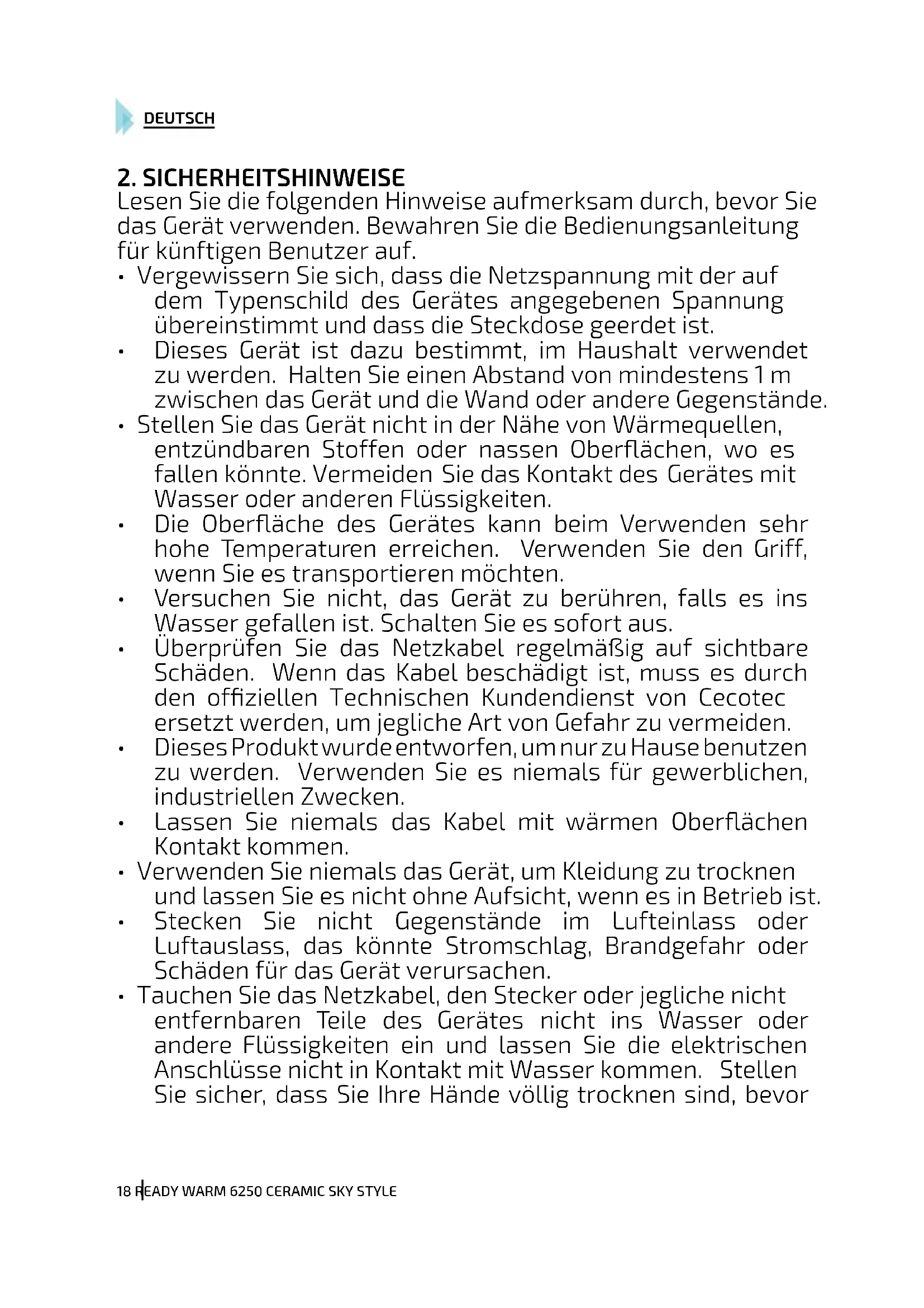 BEDIENUNGSANLEITUNG Ready Warm 6250 Ceramic Sky Style CECOTEC