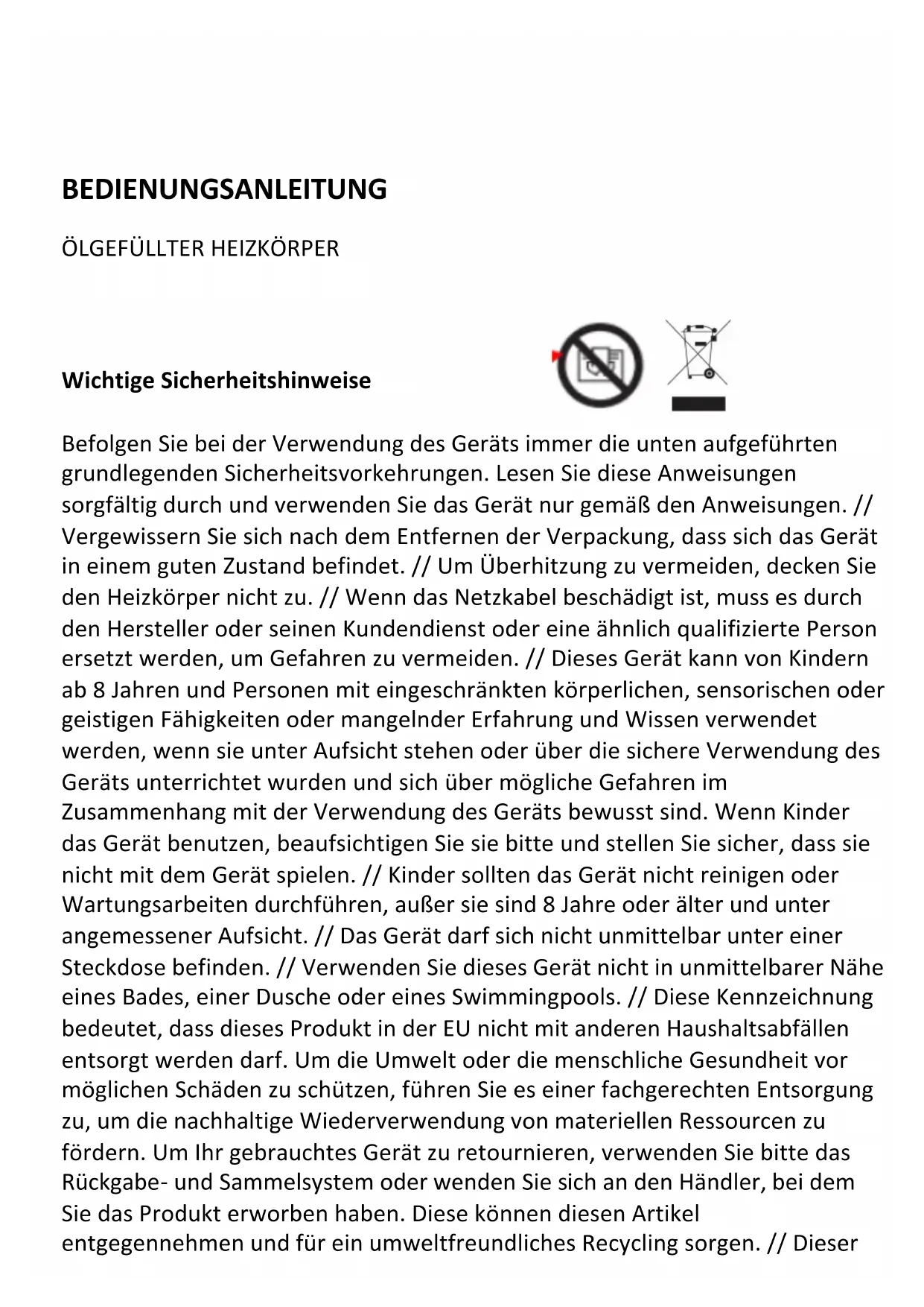 Wichtige Sicherheitshinweise Befolgen Sie bei der Verwendung des Geräts immer die unten aufgeführten grundlegenden Sicherheitsvorkehrungen. Lesen Sie diese Anweisungen sorgfältig durch und verwenden Sie das Gerät nur gemäß den Anweisungen. // Vergewissern Sie sich nach dem Entfernen der Verpackung, dass sich das Gerät in einem guten Zustand befindet. // Um Überhitzung zu vermeiden, decken Sie den Heizkörper nicht zu. // Wenn das Netzkabel beschädigt ist, muss es durch den Hersteller oder seinen Kundendienst oder eine ähnlich qualifizierte Person ersetzt werden, um Gefahren zu vermeiden. // Dieses Gerät kann von Kindern ab 8 Jahren und Personen mit eingeschränkten körperlichen, sensorischen oder geistigen Fähigkeiten oder mangelnder Erfahrung und Wissen verwendet werden, wenn sie unter Aufsicht stehen oder über die sichere Verwendung des Geräts unterrichtet wurden und sich über mögliche Gefahren im Zusammenhang mit der Verwendung des Geräts bewusst sind. Wenn Kinder das Gerät benutzen, beaufsichtigen Sie sie bitte und stellen Sie sicher, dass sie nicht mit dem Gerät spielen. // Kinder sollten das Gerät nicht reinigen oder Wartungsarbeiten durchführen, außer sie sind 8 Jahre oder älter und unter angemessener Aufsicht. // Das Gerät darf sich nicht unmittelbar unter einer Steckdose befinden. // Verwenden Sie dieses Gerät nicht in unmittelbarer Nähe eines Bades, einer Dusche oder eines Swimmingpools. // Diese Kennzeichnung bedeutet, dass dieses Produkt in der EU nicht mit anderen Haushaltsabfällen entsorgt werden darf. Um die Umwelt oder die menschliche Gesundheit vor möglichen Schäden zu schützen, führen Sie es einer fachgerechten Entsorgung zu, um die nachhaltige Wiederverwendung von materiellen Ressourcen zu fördern. Um Ihr gebrauchtes Gerät zu retournieren, verwenden Sie bitte das Rückgabe- und Sammelsystem oder wenden Sie sich an den Händler, bei dem Sie das Produkt erworben haben. Diese können diesen Artikel entgegennehmen und für ein umweltfreundliches Recycling sorgen. // DieserHeizkörper kann keine genaue Temperaturregelung der Umgebung erreichen und kann daher nicht als Isolationsvorrichtung für Lagerumgebungen, Gegenstände, Tiere und Pflanzen verwendet werden. // Dieser Heizkörper ist mit einer genauen Menge Spezialöl gefüllt. Reparaturen, die ein Öffnen des Ölbehälters erfordern, dürfen nur vom Hersteller oder seinem Kundendienst durchgeführt werden, der bei einem Ölaustritt kontaktiert werden sollte. Befolgen Sie beim Entsorgen des Geräts die Vorschriften zur Entsorgung von Öl. // 10. Dieser Heizkörper kann keine genaue Temperaturregelung der Umgebung erreichen und kann daher nicht als Isolationsvorrichtung für Lagerumgebungen, Gegenstände, Tiere und Pflanzen verwendet werden. // Dieses Gerät ist nur für den Gebrauch im Haushalt vorgesehen. Vorsicht Brandgefahr besteht, wenn der Heizkörper von Vorhängen oder anderen brennbaren Materialien abgedeckt oder in deren Nähe positioniert wird. // Einige Teile dieses Produktes können sehr heiß werden und Verbrennungen verursachen. Besondere Vorsicht ist geboten, wenn Kinder und gefährdete Personen anwesend sind.ABBILDUNG MIT TEILEN (OR2000M) Lamellen Leistungsschalter Thermostatknopf Kabelaufwicklung Rollfüße VERWENDUNG DES ÖLGEFÜLLTEN HEIZKÖRPERS (OR2000M)