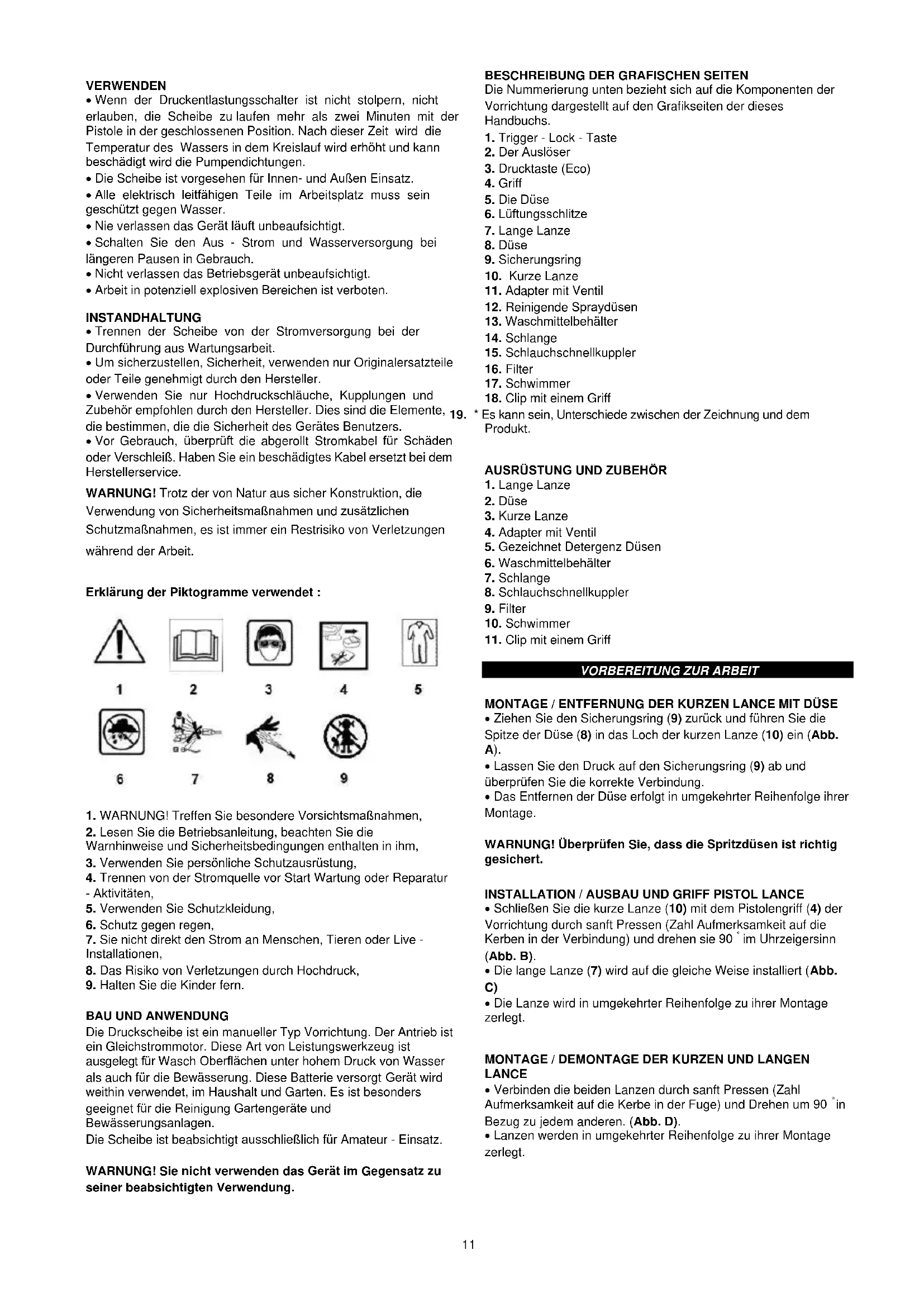 - Der Hochdruckwasserstrahl kann sein gefährlich, wenn nicht verwendet, richtig. Der Strom muss nicht sein gerichtet an Menschen, Tiere, elektrische Ausrüstung und die Einrichtung selbst.