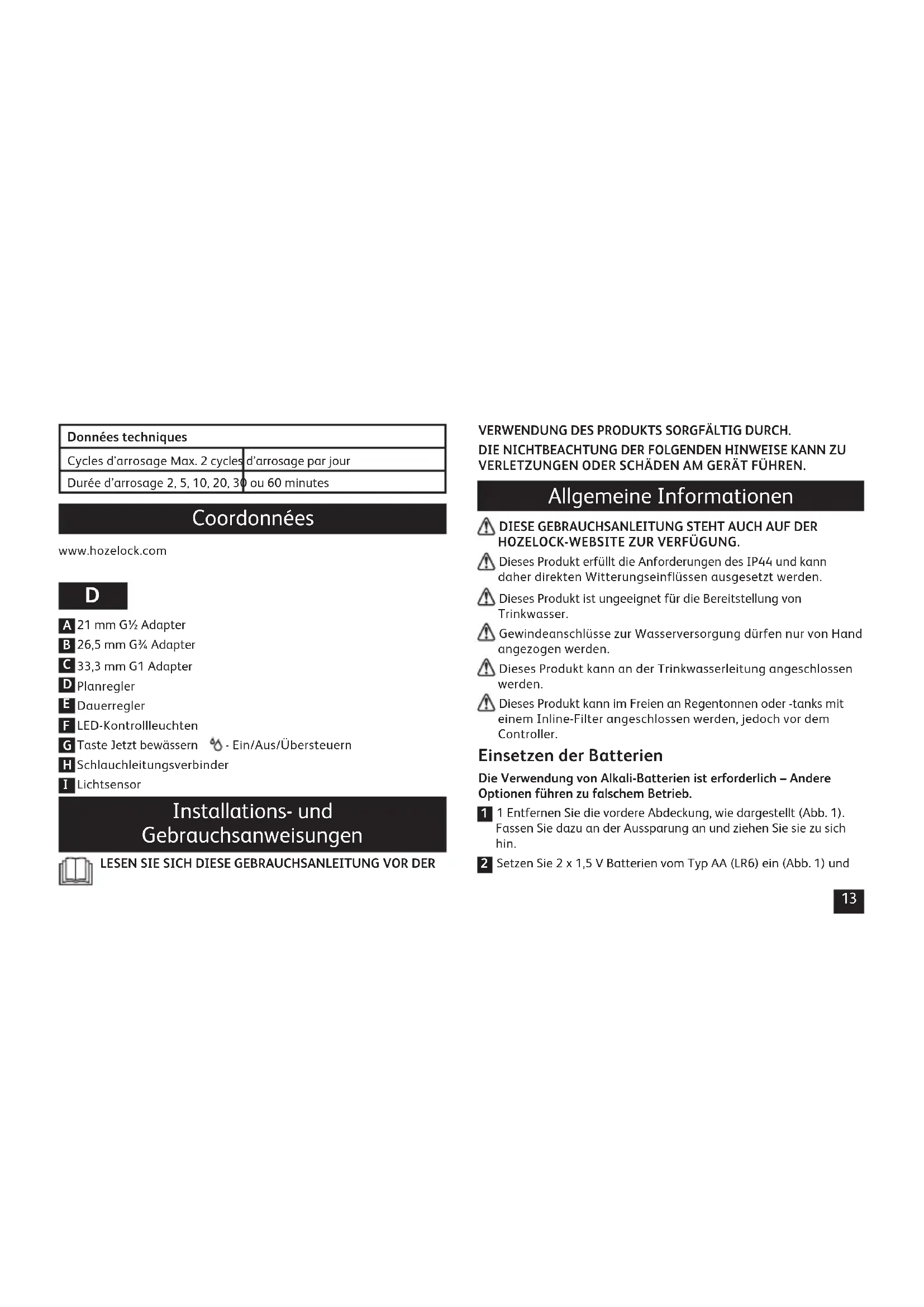 HOZELOCK-WEBSITE ZUR VERFÜGUNG. Dieses Produkt erfüllt die Anforderungen des IP44 und kann daher direkten Witterungseinflüssen ausgesetzt werden. Dieses Produkt ist ungeeignet für die Bereitstellung von Trinkwasser. Gewindeanschlüsse zur Wasserversorgung dürfen nur von Hand angezogen werden. Dieses Produkt kann an der Trinkwasserleitung angeschlossen werden. Dieses Produkt kann im Freien an Regentonnen oder -tanks mit einem Inline-Filter angeschlossen werden, jedoch vor dem Controller. Einsetzen der Batterien Die Verwendung von Alkali-Batterien ist erforderlich – Andere Optionen führen zu falschem Betrieb.