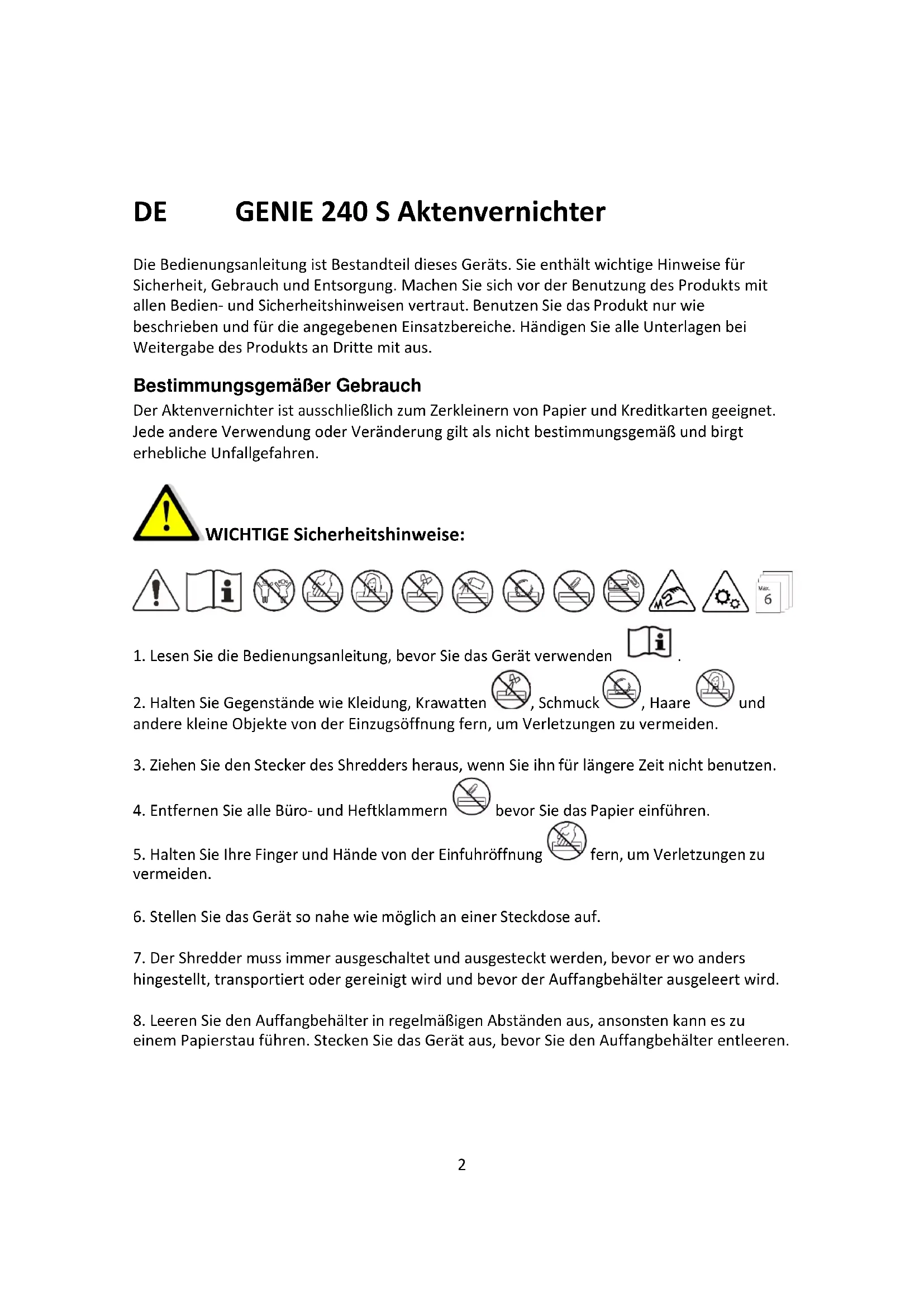 einen längeren Zeitraum nicht in Gebrauch ist.5 Kapazität des Aktenvernichters Der GENIE 240 S schneidet bis zu 6 Blatt Papier (DIN A4, 80 g). Die Papierbreite kann bis zu 22 cm betragen. Beim Zerkleinern von kleinen Papieren, wie beispielsweise Briefumschlägen oder Kreditkartenquittungen, führen Sie diese in die Mitte der Eingabeöffnung ein. Bitte achten Sie darauf, dass nie mehr als die oben angegebene Maximalmenge in die Eingabeöffnung eingeführt wird. Das Gerät kann dadurch beschädigt werden. Schutz vor Papierstaus und Überlastungen Der GENIE 240 S ist mit einem Motoren-Überlastungsschutz ausgestattet. Wenn der automatische Überlastungsschutz des Motors ausgelöst wird, wird die Stromzufuhr zum Gerät unterbrochen. Ursachen können die folgenden sein: