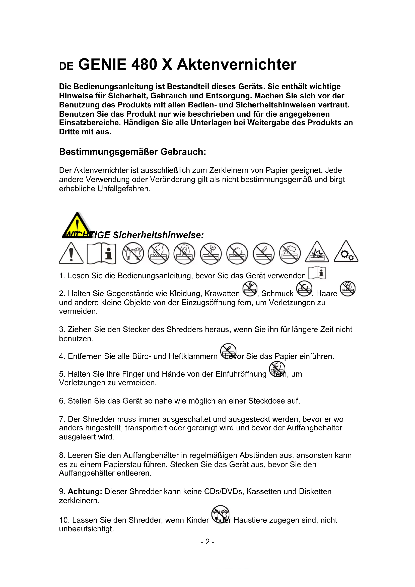 V 1.15 05/2022 ID: 12468 GO Europe GmbH Zum Kraftwerk 1 45527 Hattingen Deutschland www.go-europe.com- 2 - DE GENIE 480 X Aktenvernichter Die Bedienungsanleitung ist Bestandteil dieses Geräts. Sie enthält wichtige Hinweise für Sicherheit, Gebrauch und Entsorgung. Machen Sie sich vor der Benutzung des Produkts mit allen Bedien- und Sicherheitshinweisen vertraut. Benutzen Sie das Produkt nur wie beschrieben und für die angegebenen Einsatzbereiche. Händigen Sie alle Unterlagen bei Weitergabe des Produkts an Dritte mit aus. Bestimmungsgemäßer Gebrauch: Der Aktenvernichter ist ausschließlich zum Zerkleinern von Papier geeignet. Jede andere Verwendung oder Veränderung gilt als nicht bestimmungsgemäß und birgt erhebliche Unfallgefahren.