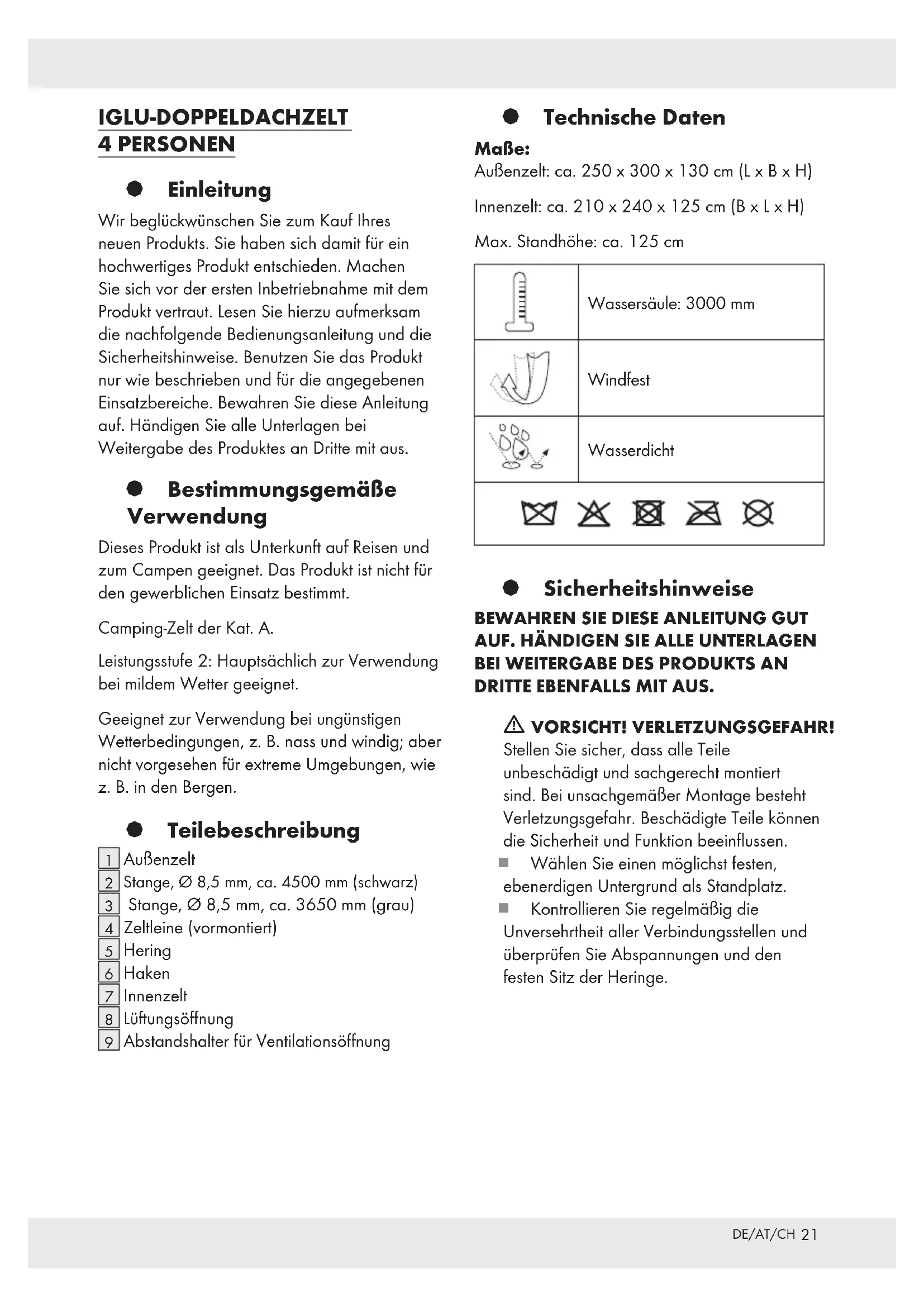 DRITTE EBENFALLS MIT AUS. m VORSICHT! VERLETZUNGSGEFAHR! Stellen Sie sicher, dass alle Teile unbeschädigt und sachgerecht montiert sind. Bei unsachgemäßer Montage besteht Verletzungsgefahr. Beschädigte Teile können die Sicherheit und Funktion beeinflussen. Wählen Sie einen möglichst festen, ebenerdigen Untergrund als Standplatz. Kontrollieren Sie regelmäßig die Unversehrtheit aller Verbindungsstellen und überprüfen Sie Abspannungen und den festen Sitz der Heringe.22 DE/AT/CH Verwenden Sie kein Insekten-Spray in oder auf dem Zelt. Kleine undichte Stellen an den Nähten können mit einem Nahtspray behoben werden. Für die Zelthaut kann ein Imprägnierspray verwendet werden. m VORSICHT! VERGIFTUNGSGEFAHR UND GEFAHR DER SACHBESCHÄDIGUNG! Entzünden Sie kein Feuer innerhalb des Produkts und halten Sie es von Wärmequellen fern. Machen Sie sich zudem mit den Brandschutzbestimmungen vor Ort (z.B. Campingplatz, Zeltplatz) vertraut. Warnung! Erstickungsgefahr! Falls der Innenraum des Zeltes nicht adäquat belüftet wird, besteht unter Umständen Erstickungsgefahr. Stellen Sie sicher, dass die Lüftungsöffnungen an den Seiten des Innenzelts zu keiner Zeit verdeckt werden. Lassen Sie Kinder niemals unbeaufsichtigt im Zelt. § Vorsichtsmaßnahmen gegen Feuer Zum sicheren Campen sind folgende Regeln des gesunden Menschenverstandes zu befolgen: Keine heißen Geräte in der Nähe der Wände, des Daches oder der Vorhänge aufstellen. Immer die Sicherheitsinstruktionen für diese Geräte beachten. Niemals Kindern erlauben, in der Nähe von heißen Geräten zu spielen. Lassen Sie die Durchgänge frei. Stellen Sie die Ausgänge nicht mit Gegenständen zu. Erkundigen Sie sich nach den Einrichtungen und Vorkehrungen gegen Feuer auf dem Gelände. § Zelt aufbauen Im Inneren der Tragetasche befindet sich ein Label, auf den ein QR-Code gedruckt ist. Beim Scannen des QR-Codes werden Ihnen Details zum Aufbau des Produkts angezeigt. Achten Sie darauf, dass das Produkt nur von fachkundigen Personen montiert wird. Hinweis: Das Polyestermaterial des Außenzeltes besteht aus wasserabweisendem Material. Während der ersten Verwendung bei Regen ist es möglich, dass das Zelt nicht vollständig wasserdicht ist. Durch die Nässe ziehen sich aber die Fäden des Zeltes zusammen und so wird das Zelt nach einer kurzen Zeit wasserdicht. Montieren Sie das Produkt gemäß den Abbildungen A bis F. Abbildung A: