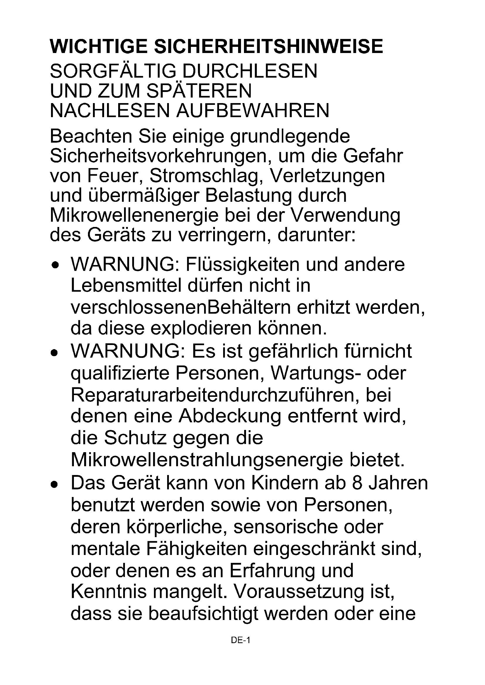 - WARNING: Flüssigkeiten und andere Lebensmittel)dürfen nicht in verschlossenenBehätern erhützt werden, da diese explodieren können.